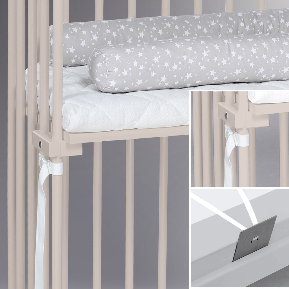 Introducing the babybay® Beige Varnished Boxspring Co-Sleeper, a harmonious blend of comfort and safety designed for higher beds. This co-sleeper features patented, adjustable height settings that ensure it levels perfectly with any boxspring bed, eliminating gaps for a safer sleeping environment. Its superior ventilation system complements our custom mattresses to promote excellent air circulation, essential for your child's comfort.