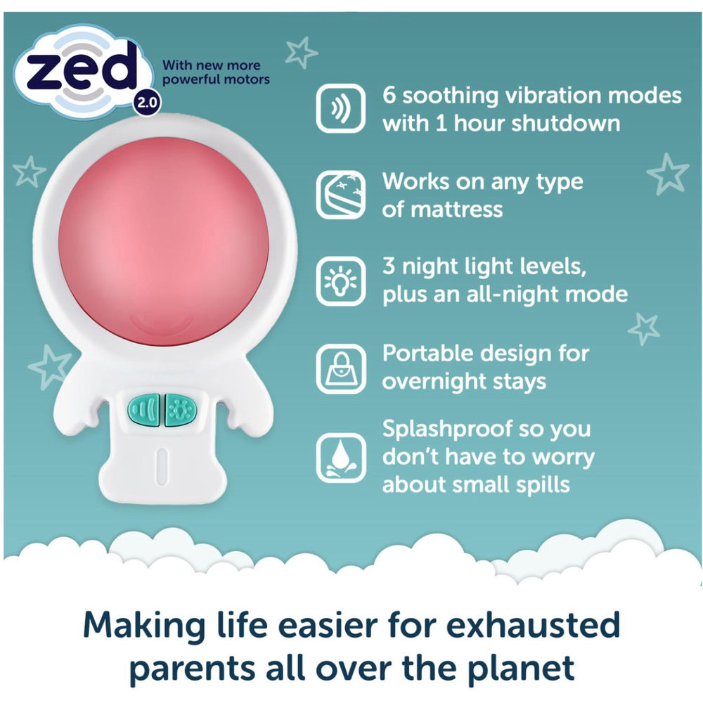 Meet Zed, the game-changer in baby comfort accessories from Rockit, designed to effortlessly soothe your infant into a deep sleep. This innovative little device mimics the calming vibrations of a car ride, making those long nights much easier. Zed doesn't just help your baby drift off; it also doubles as a portable night light, ideal for late-night feedings or diaper changes. Simply place Zed at your baby's feet on any mattress, select from one of the six vibration modes, and let its low-frequency pulsations lull your baby to sleep. Plus, with a battery life of up to 50 hours and automatic shut-off after an hour, Zed ensures both safety and convenience. This essential nursery item is a must-have for any parent striving for peaceful nights and joyful days. Age: From 0 years Measurements: Height: 6 cm, Length: 9 cm, Width: 13 cm Washing instructions: Remember to follow washing and user instructions