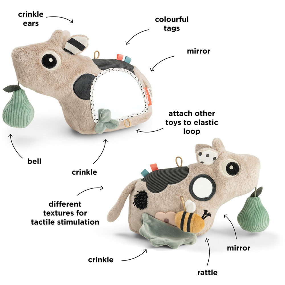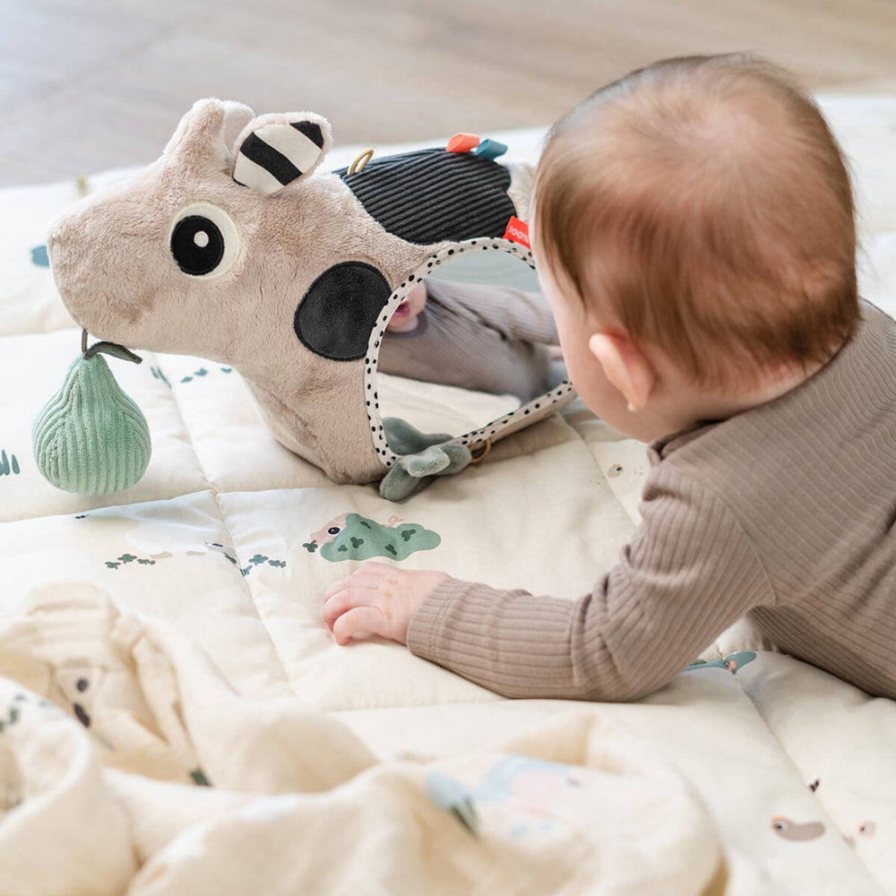 Explore the enchanting world of the DonebyDeer Dotti Sand Activity Floor Mirror, designed meticulously for tiny explorers. This interactive toy tantalizes the senses through touch, sound, and sight, aiding sensory growth. It includes safe, engaging features that encourage infants to reach, touch, and discover, promoting motor development and early self-awareness with its intriguing mirror. Lightweight and easy to store, it's perfect for on-the-go entertainment and effortless maintenance, making it an essential for nurtative play and learning. Ideal for tummy time, it will keep your little one fascinated and joyful as they explore their reflection and the wonders around them. Age: 0+ Materials: Fabric: polyester and cotton. Filling: 100% polyester fibres. Measurements: 27 x 11.5 x H 19 cm.