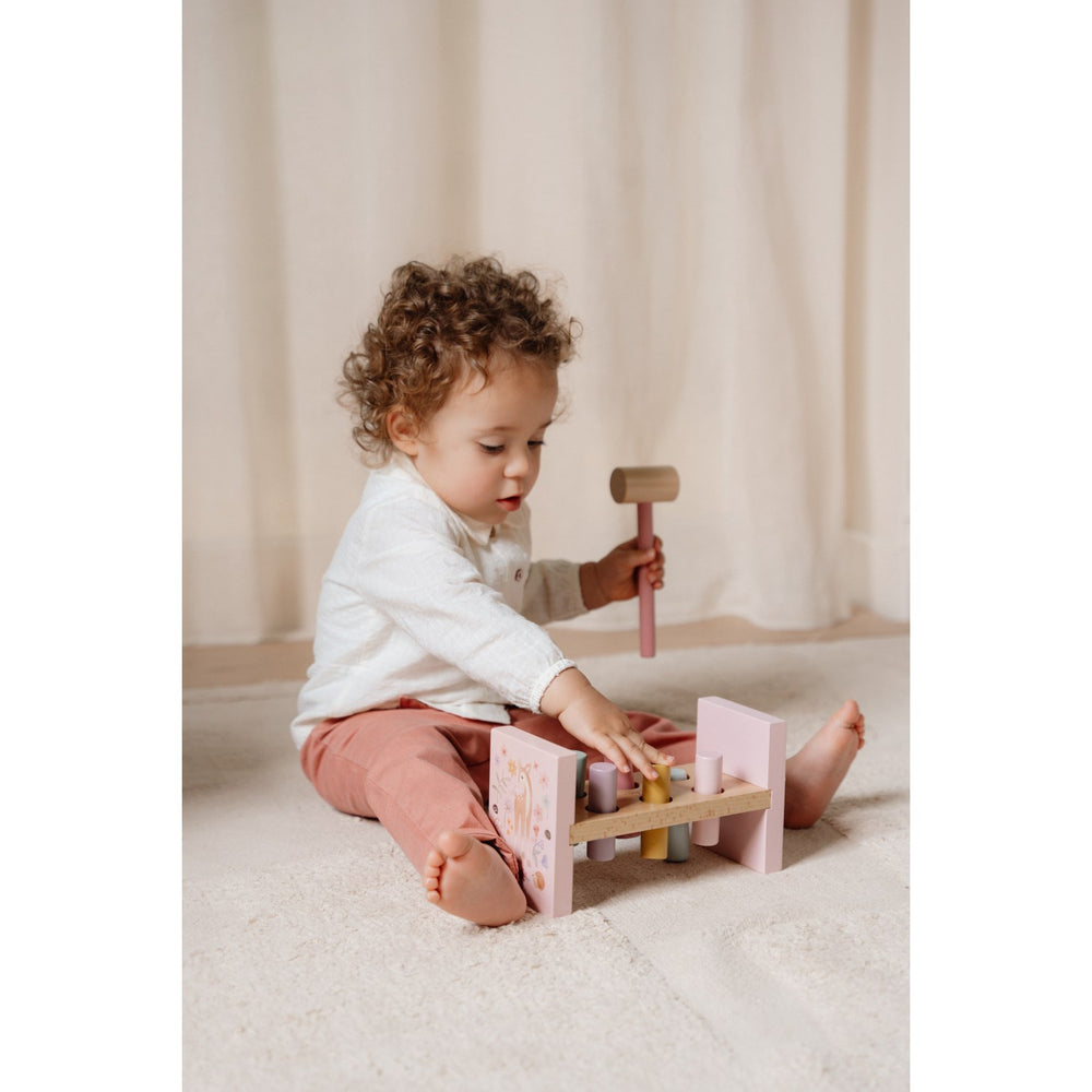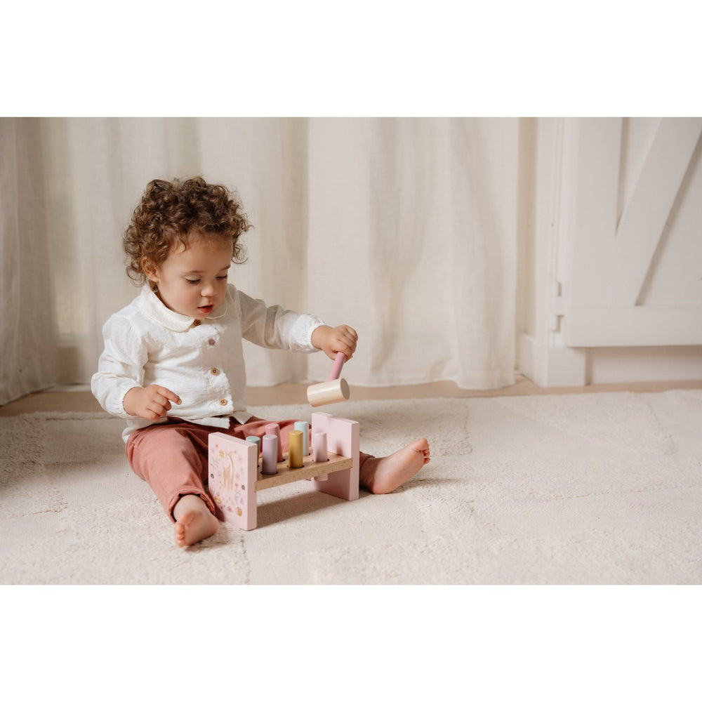 Discover endless fun with the Little Dutch Fairy Garden Pink Pounding Bench! This delightful toy allows your little one to hammer six colorful sticks into a sturdy wooden bench, then flip it over to start again. Not only is it fantastic for enhancing motor skills, but its safety-tested design ensures a secure playtime. Ideal for young children, this toy is easy to store and maintain, making it the perfect addition to your child's playroom. Engage and educate through play with this charming pounding bench! Materials: FSC-certified wood Certifications: FSC-certificering