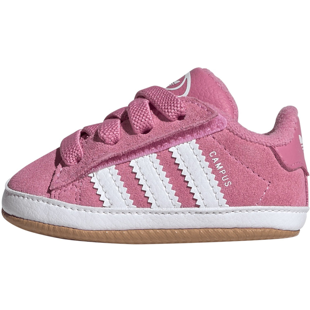 Delight your little one's first steps with these charming adidas Originals Campus 00S Crib Sneakers! Reimagined for infants, they feature a vibrant Bliss Pink suede upper with contrasting Ftwr White details and a playful Gum 2 sole, mirroring the classic adult design. Beyond style, they offer supreme comfort with a soft interior lining and effortless wearability with practical hook-and-loop straps for quick fitting. Perfect for active babies, these sneakers ensure both style and ease in every little adventure.