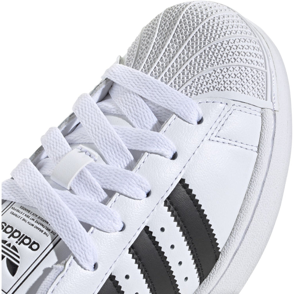 Delight in the iconic revival of the adidas Originals Superstar II J Sneakers, designed perfectly for the energetic lifestyle of juniors. These sneakers feature a sleek, full-grain leather upper in a crisp Ftwr White/Core Black colorway, harmonized with the classic shell toe and serrated 3-Stripes that echo timeless style. The snug fit and size options ensure they grow with your child's adventures, enhancing comfort with a molded sockliner and a robust rubber cupsole, outfitted with a herringbone traction pattern for superior grip. The fusion of '90s and '00s aesthetics with modern features makes these shoes a versatile addition to any young trendsetter's wardrobe. Whether paired with casual or sporty attire, these sneakers promise to elevate both comfort and style. Ideal for daily wear, the easy-care design keeps these kicks looking great day after day. Closure: Laces Fit: Regular Materials: Upper: Synthetic, Leather, Lining: Textile, Sole: Rubber Extra: Serrated 3-stripes, Superstar box logo on the tongue, Trefoil logo on the heel tab.