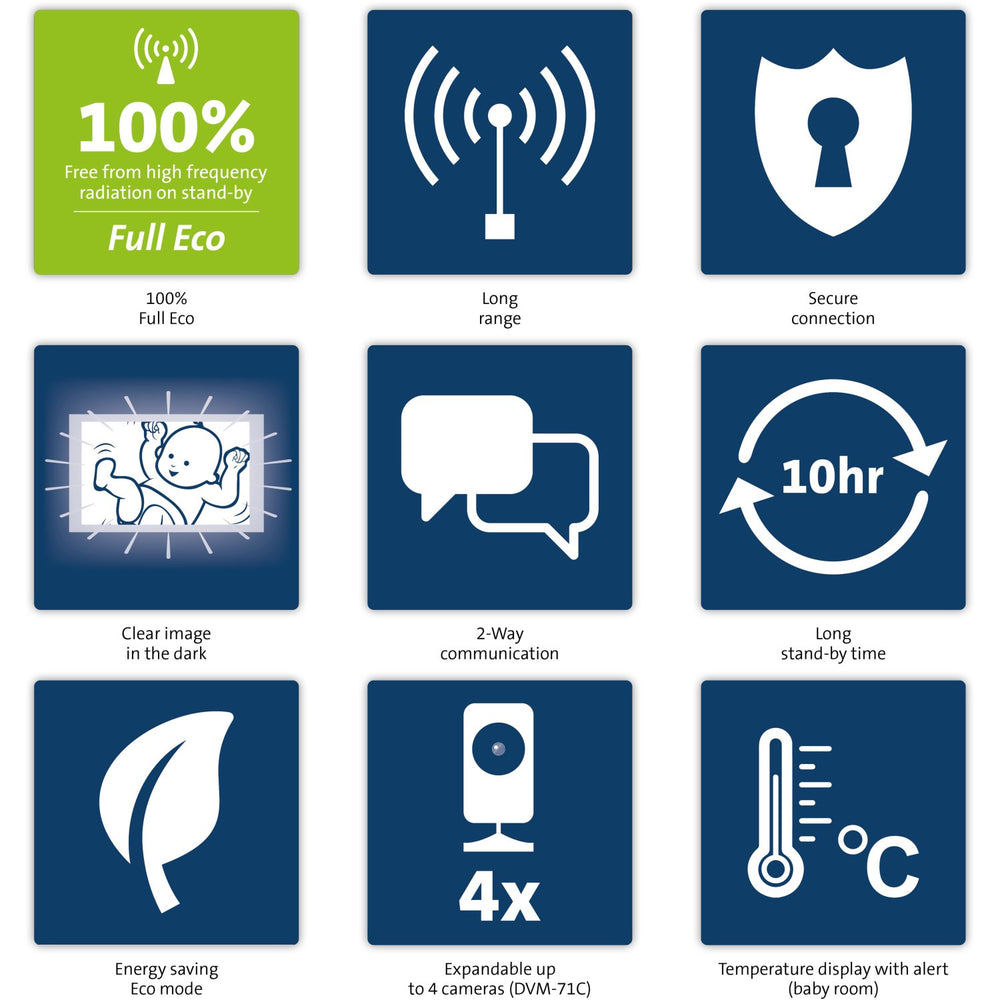 Safety and comfort go hand in hand with this high-quality model, which boasts reliability and ease of use – key factors in choosing the right baby monitor. The unit comes with a default single camera setup but offers expandability to accommodate up to four cameras, making it ideal for monitoring different rooms. Not only is it a functional tool in baby care, but it also serves as a source of reassurance with its excellent energy-saving eco-mode to extend battery life and maintain an optimal room temperature, thanks to its built-in temperature gauge.