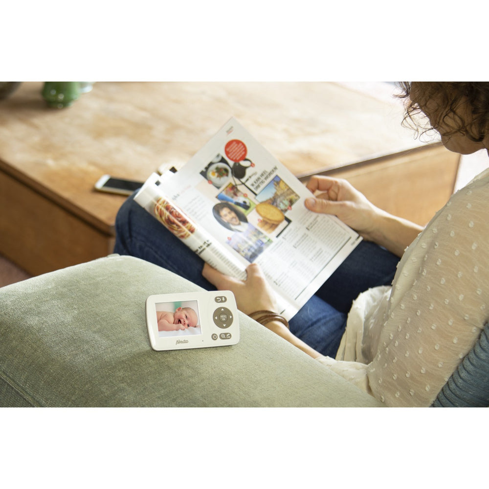 Discover the Alecto White/Taupe Video Monitor, an invaluable companion in your daily parenting life. This easy-to-use baby phone, featuring a 2.4-inch color display and camera, ensures your peace of mind by providing a clear view of your little one, even in total darkness thanks to its outstanding night vision capability. It's engineered for seamless communication with a practical talk back function, allowing you to soothe your baby with your voice.