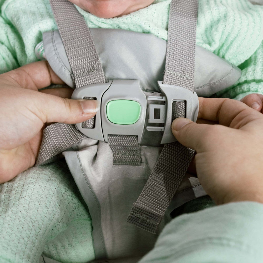 • Washing instructions: Seat pad – Remove from frame. Fasten buckles on seat restraint and seat pad. Fasten all hook-and-loop patches to the corresponding patch. Machine wash with cold water, gentle cycle. No bleach. Tumble dry, low heat. Headrest – Fasten all hook-and-loop patches. Machine wash with cold water, gentle cycle. No bleach. Air dry flat. Toy bar and toy – Wipe clean with a damp cloth and mild soap. Air dry. Do not immerse in water. Frame – Wipe the metal frame with soft, clean cloth and mild soap. Storage – When putting swing away for storage, always store in a dry location, away from any heat sources, and out of the sun.