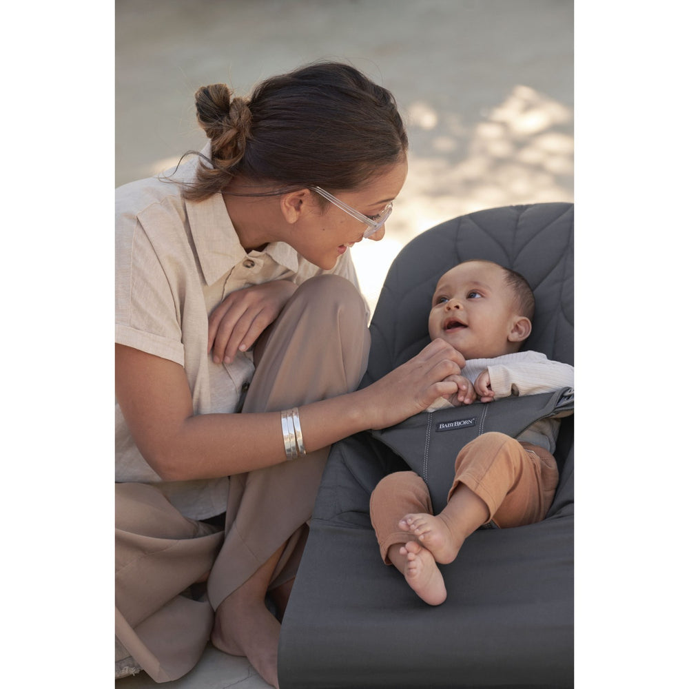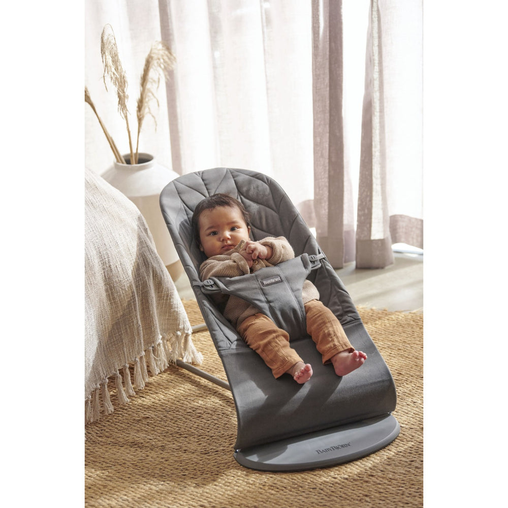 Introducing the BabyBjörn Anthracite Grey Bouncer Bliss, a perfect blend of style and practicality wrapped in a woven, flower leaf quilt design. Designed meticulously for infants, this bouncer stands out with its safety certifications and easy maintenance. Enjoy the ease of use as it requires no batteries, operating solely on your baby’s natural movements which contribute to their motor skills and balance development. Its lightweight design ensures that it can be effortlessly transported around the home or packed for trips. Further, it offers versatile storage solutions, keeping your space organized while providing a stimulating environment for your baby through its comforting natural rocking. The Bouncer Bliss not only supports your baby's early developmental stages but also gives you a hands-free experience ensuring a safer, comfortable, and engaging setting for your child. This product is backed by a 10-year guarantee, emphasizing durability and long-term satisfaction.