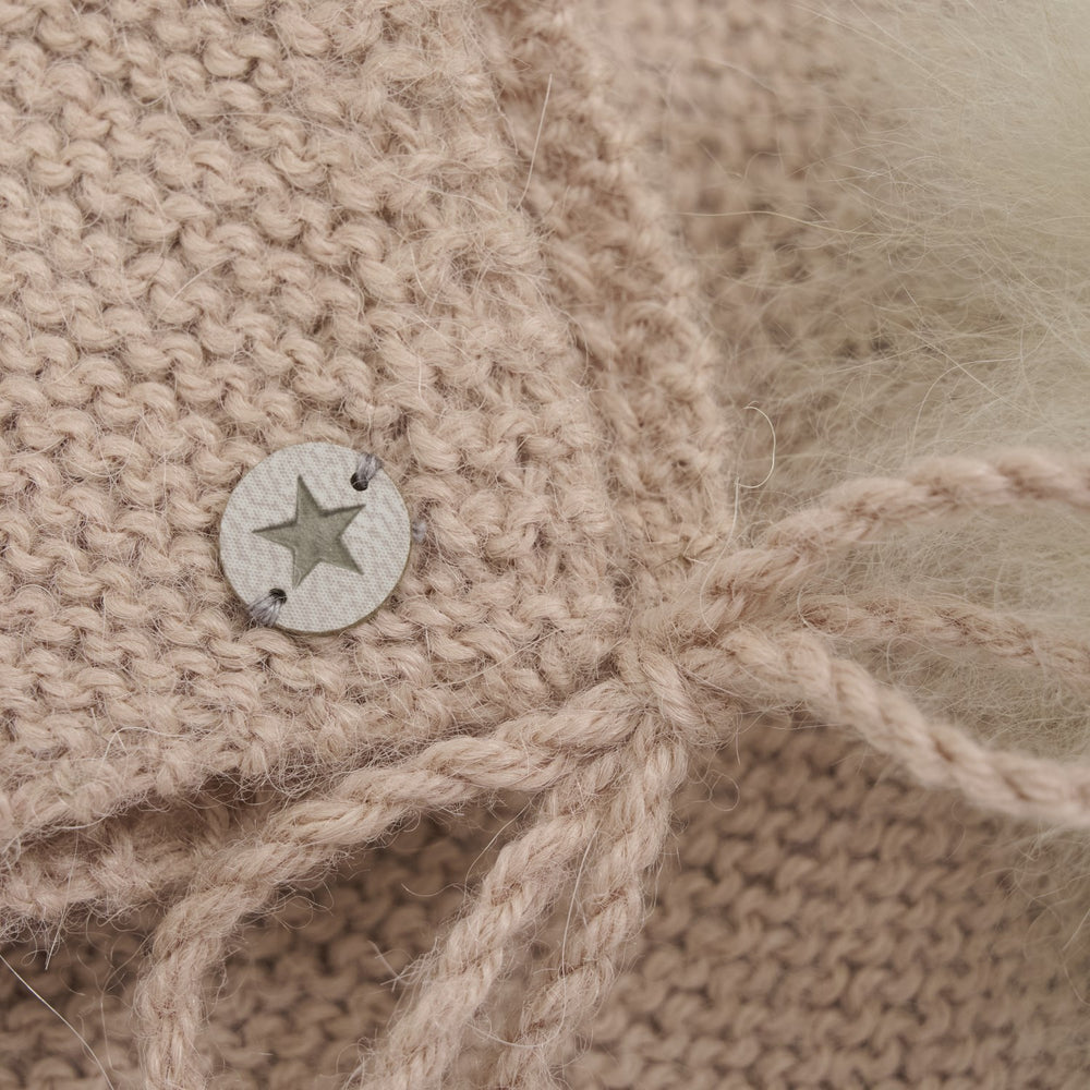 Wrap your little one in the cozy embrace of our Huttelihut Mahogany Rose Bonnet. This charming wool knit bonnet, skillfully hand-knitted with the softest alpaca wool, guarantees warmth and comfort. It features a distinctive round head design that snugly covers the ears and forehead for added protection against the cold. The eye-catching alpaca fur pompom, responsibly sourced as a Fairtrade product from Bolivian highlands, adds a touch of whimsy. Each unique pompom varies in color and expression, celebrating nature's palette without artificial dyes.
