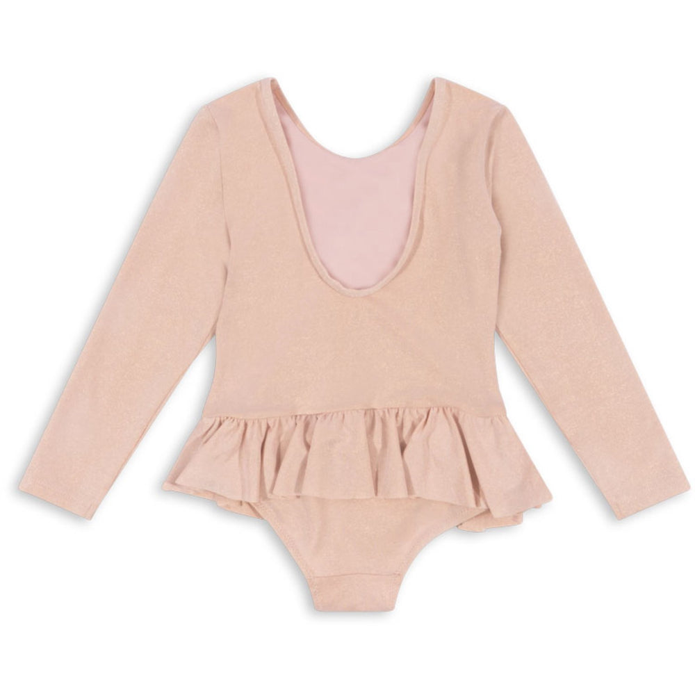 Introducing the Konges Sløjd Evening Sand Jade LS Swimsuit, a perfect blend of style and functionality for your little one's water adventures. Crafted from a durable mix of 82% nylon, 10% lurex, and 8% elastane, this long-sleeved swimsuit showcases a shiny finish complemented by a charming sequin decoration on the front. The elegant low scoop back adds a touch of sophistication, while its CE certification ensures top-quality and safety. Ideal for both pool parties and beach fun, its comfortable fit and resilient fabric make it a must-have in your child's wardrobe.