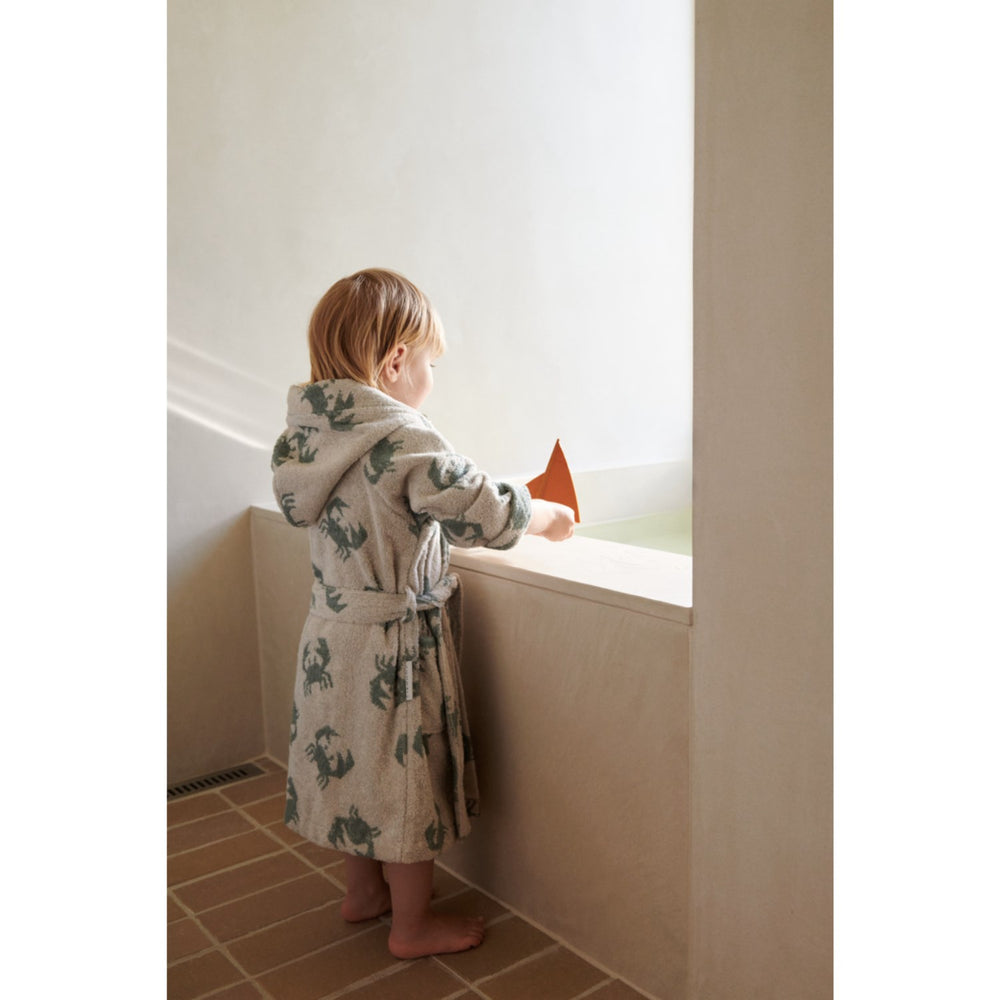 Envelop your child in softness and warmth after bath time with LIEWOOD's Lilana bathrobe. This charming robe, designed in elegant sandy crab colours and patterns, is made of strong, organic terry cotton, which not only offers optimal absorption, but also warmth and comfort. With practical details like an attachment belt and snap buttons, it ensures that the bathrobe stays in place while your child plays or relaxes. Perfect for young children, the bathrobe is comfortable and easy to maintain, making it an ideal choice for any parent who wants quality and functionality for their child's wardrobe.