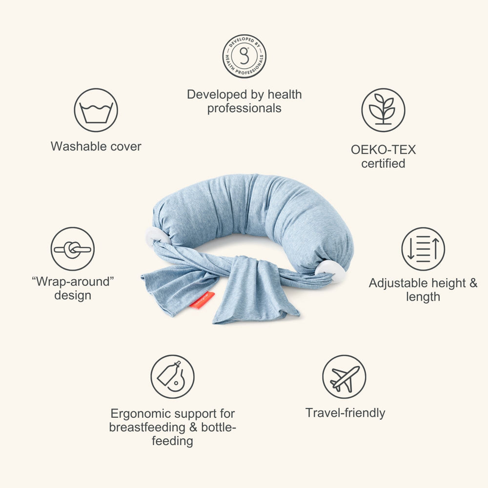 Discover comfort and peace of mind with the bbhugme® Blue/Melange Nursing Pillow. Designed by maternity care specialists in Norway and constructed with top-notch materials in Germany, this nursing pillow ensures both comfort and safety during nursing times.
