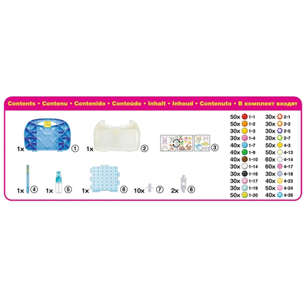 - Comprises: Beads, motif templates, water sprayer, 2-in-1 bead pen, creation decoration plate, case with flip-tray bead plate