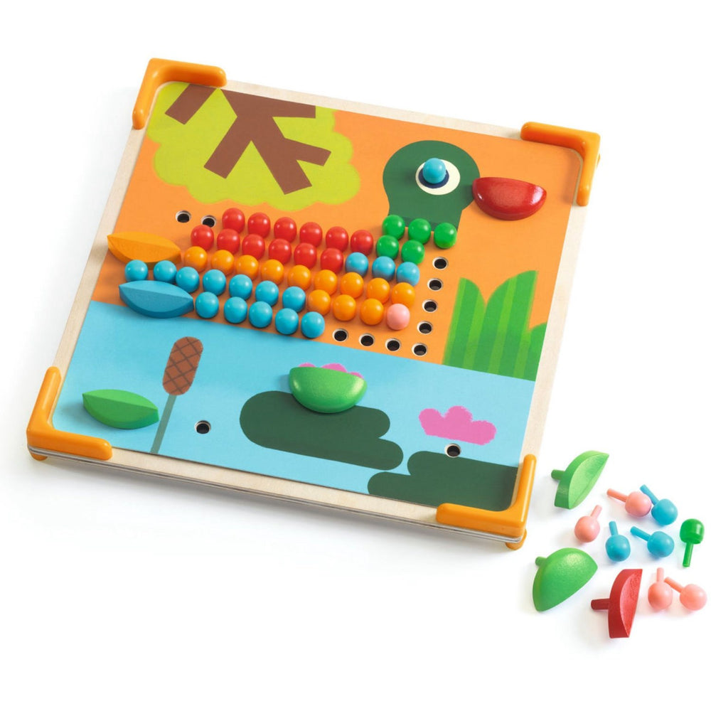 • Fun mosaic game where the child can make pictures by filling in the 8 designs with colorful sticks