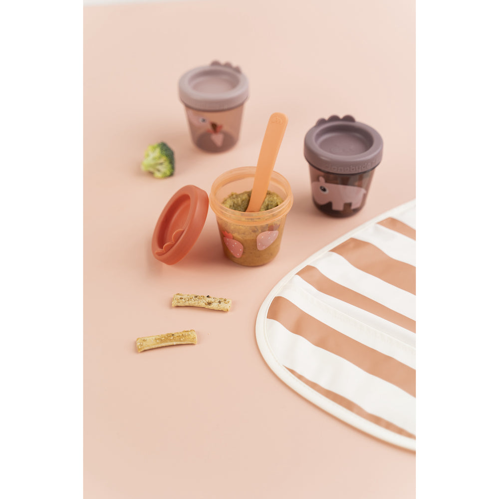 Introducing our DonebyDeer Papaya/Powder Pull-Over Bib 2-Pack in delightful stripes! Designed with busy toddlers in mind, these waterproof bibs feature an easy-to-use elastic neckband encouraging your child to dress independently at meal times. The smart front pocket is an added bonus, catching any missed bites, thereby minimizing mess and easing cleanup. Plus, its striking powder and papaya stripes make it as stylish as it is functional. Enjoy mealtime with a touch of fun and a lot less fuss! Materials: Polyester with PU coating. Elastic neckline. Measurements: 35 x 26.5 cm.