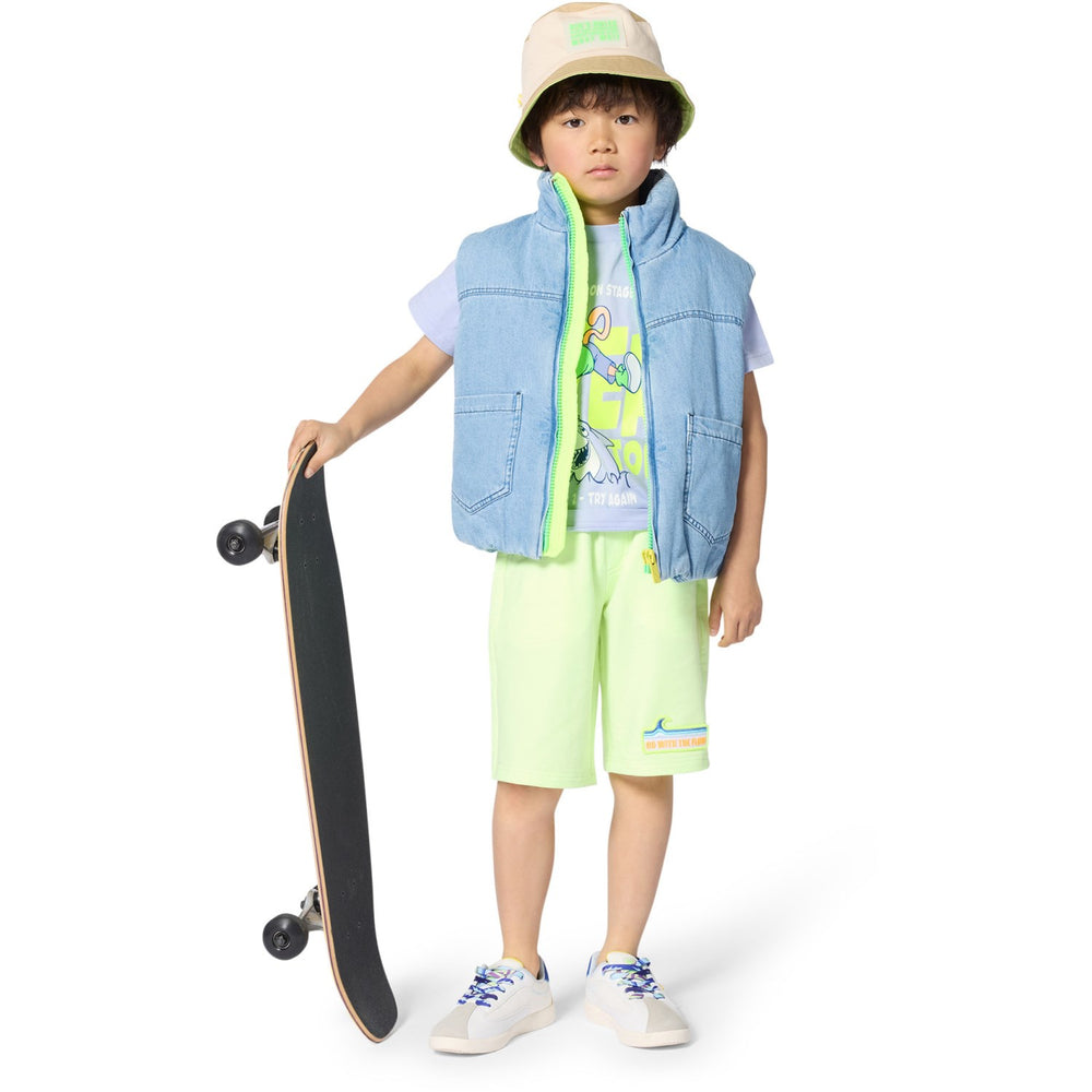 Dress your little one in the playful charm of the Billieblush Double Stone+Bleach Puffer Vest. This lightweight denim puffer is not just stylish with its vivid embroidery on the back but also functional, featuring a sleeveless design, easy zip closure, and handy front pockets. Perfect for layering, it promises both comfort and durability, making it an ideal choice for active children.