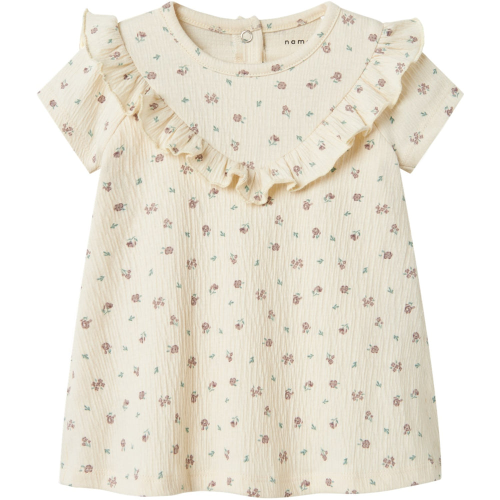 Introducing the Name It Bleached Sand Jannis Body Dress, a stylish and comfy choice for your child’s everyday wear. Made from soft, stretchy jersey, this dress ensures freedom of movement and a gentle feel on the skin. Featuring a charming, all-over print, round neck, and short sleeves with unique cut-out details, it’s as trendy as it is practical. The press stud fastening makes dressing easy, while the regular fit allows for all-day wearability. Ideal for playdates or casual outings, this dress combines fashion with functionality for young children. Care tip: Keep away from fire to maintain its pristine condition.