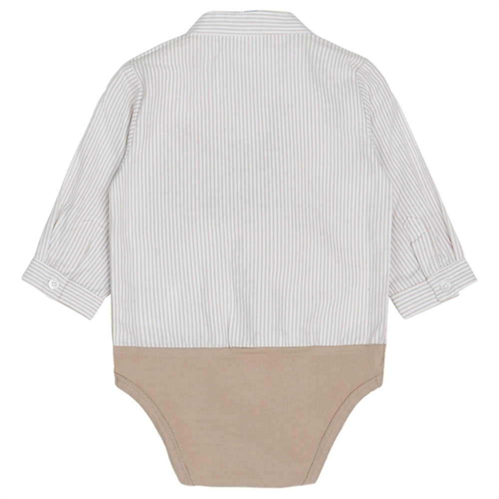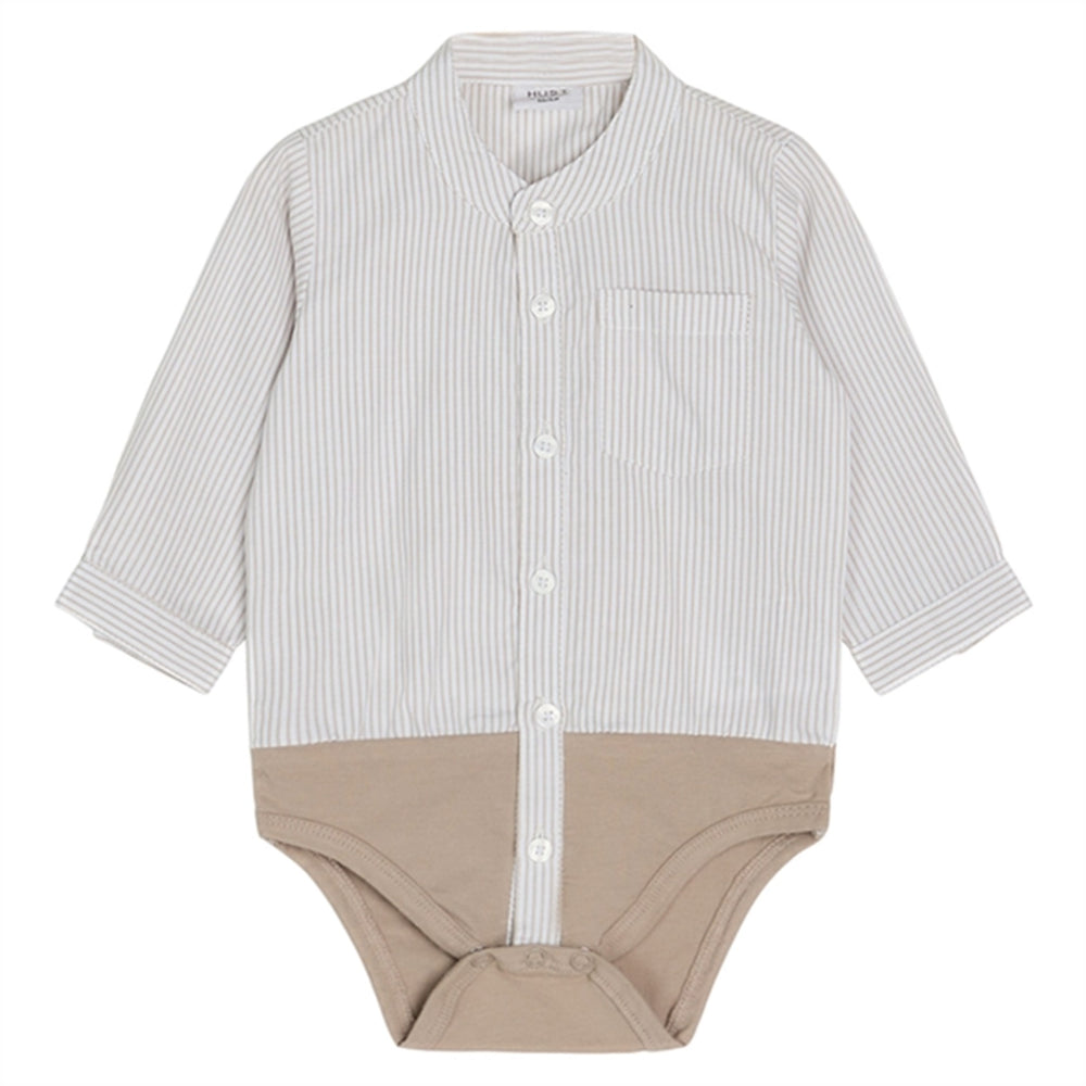 Discover the charm of our Hust & Claire Baby Bertil Shirt Body Cement NOOS, perfect for your little one. Crafted from soft cotton, this unique bodysuit features a stylish striped shirt top with a chic Chinese collar and a cozy plain jersey bottom. The practical design includes snap buttons for easy changing and a neat breast pocket adorned with an embroidered logo. The playful cuffs add a touch of elegance, making it ideal for both comfort and style. Easy to care for and wonderfully comfortable, this bodysuit is an essential addition to your child's wardrobe.