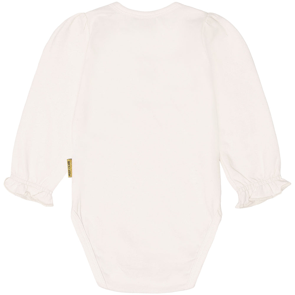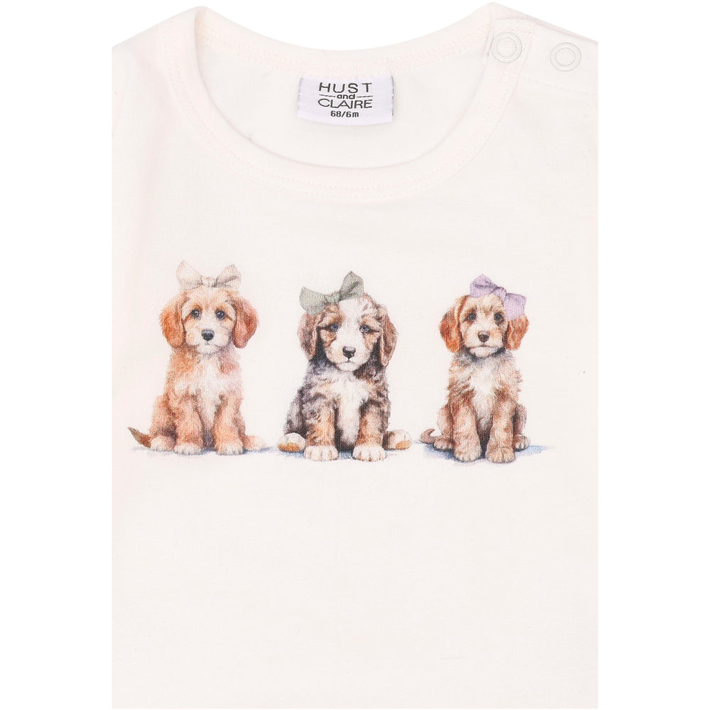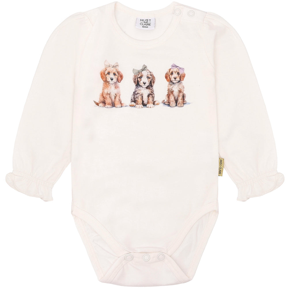 Discover the charm of Hust & Claire's Ivory Britt Bodystocking, perfect for your little one! Crafted from 95% organic cotton, this long-sleeved bodysuit boasts a delightful dog print, elasticated sleeves, and practical button closures for easy dressing. Its soft, stretchy material ensures comfort and durability, making it an adorable and sensible choice for both playtime and naptime.