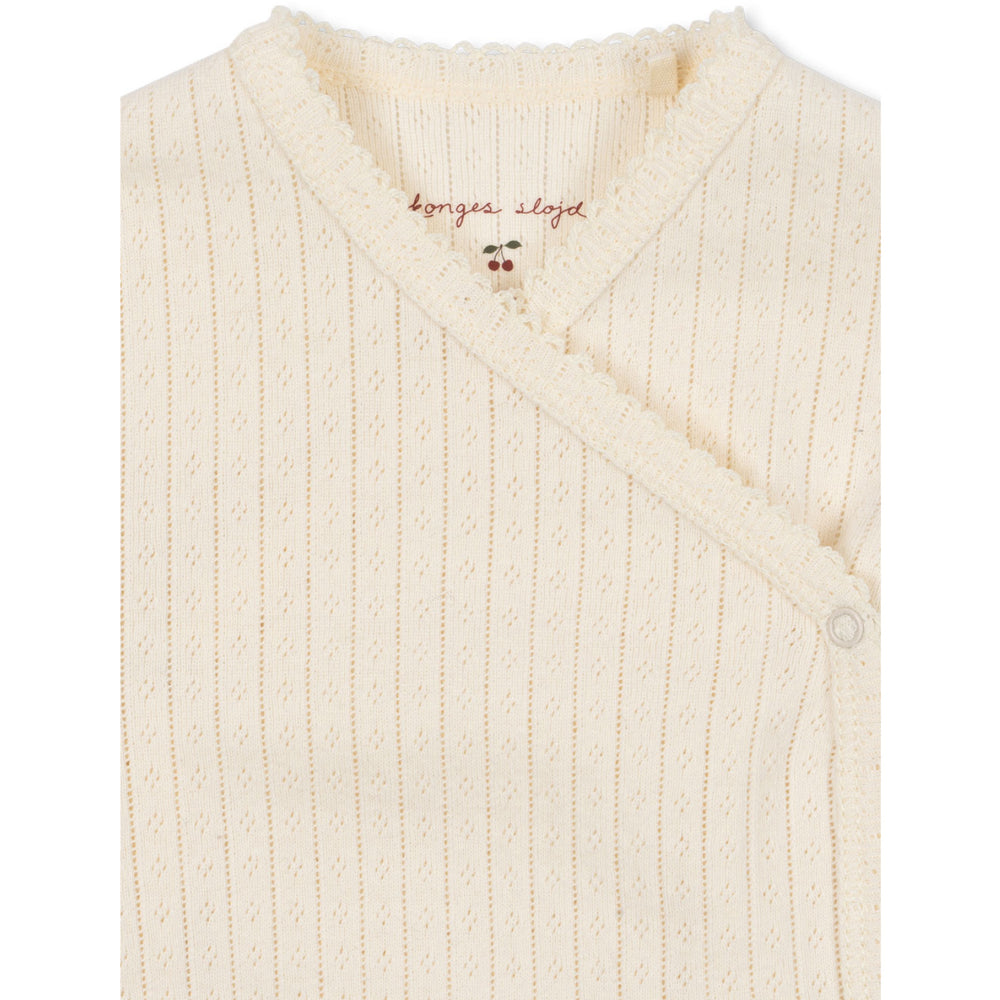 Introduce your newborn to comfort and style with the Konges Sløjd Buttercream Minnie Newborn Body. Crafted with GOTS-certified soft materials, this charming bodysuit features a delicate pointelle design and a practical wrap closure. Available in a soothing buttercream shade, it includes convenient snap buttons along the side and crotch for hassle-free dressing and diaper changes. Perfect for daily wear, this piece ensures your baby stays comfortable and stylish all day long. Materials: 100% Organic Cotton Certifications: GOTS ORGANIC