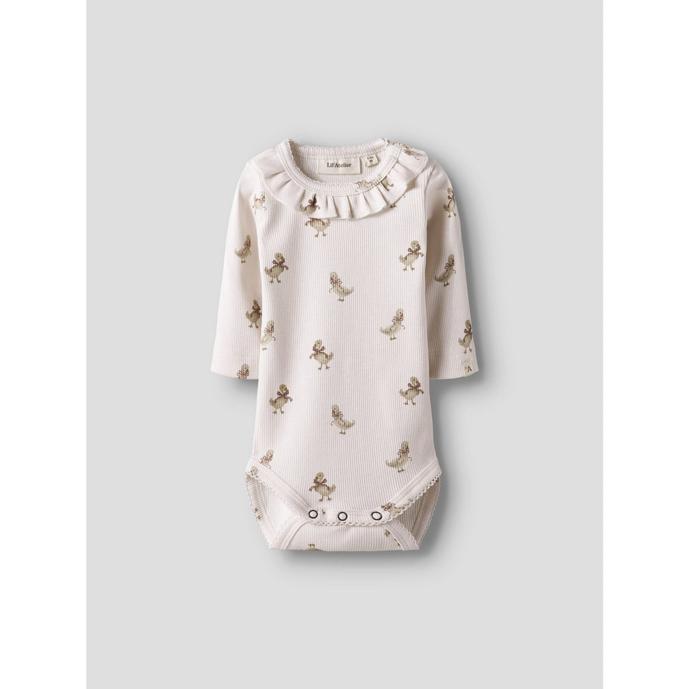 Dress your little one in the Lil'Atelier Almost Mauve Goose Nbflavo Loa Ls Slim Body, designed for comfort and style. This bodysuit features soft, stretchy jersey fabric, ensuring a snug yet flexible fit, with a gently rounded neckline and long sleeves adorned with delicate frills for a touch of charm. The all-over print adds a playful vibe, while the easy-care material offers hassle-free maintenance. Ideal for both daily wear and special occasions, this bodysuit combines functionality with a fashionable flair, keeping your child cozy and cute all day long. Please note: Keep away from fire.