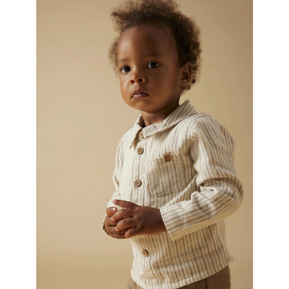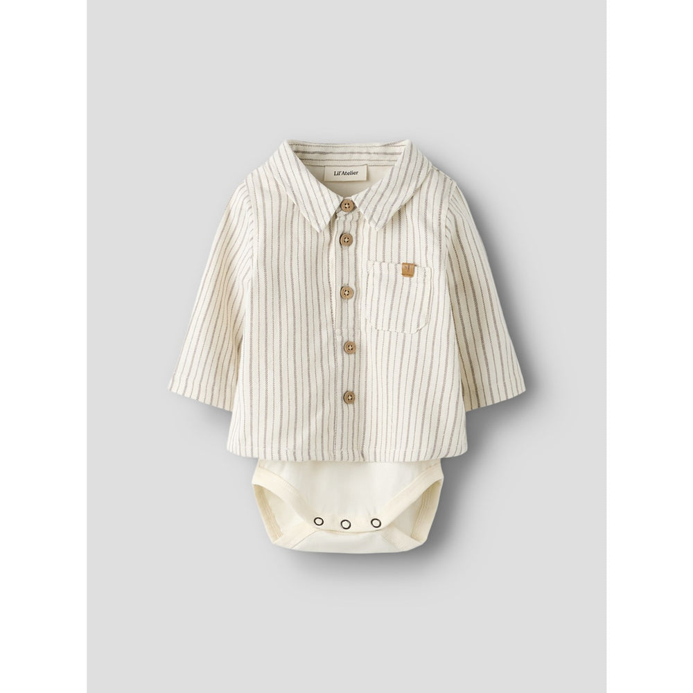 Dress your little one in the charming elegance of the Lil'Atelier Turtledove Sepia Tint Nbmfelixo Ls Body Shirt, perfect for celebrations and important gatherings. This shirt body combines the classic grandad collar with a crisp, woven fabric showcasing a criss-cross pattern that provides a textured yet clean look. Its long sleeves and regular fit ensure your child stays comfortable while looking stylish. Practical features include a convenient button front and press stud fastenings at the crotch. It also sports a chest pocket and a subtle label detail. Always remember to keep this garment away from fire to ensure your child's safety. Fit: Regular Materials: 100% Cotton - Organic Washing instructions: Maximum Washing Temperature 40°C - Normal Process Extra: The main material in this product contains a minimum of 50% organic cotton. Organic cotton is grown without the use of harmful chemicals. Organic cotton farming protects natural resources and biodiversity.