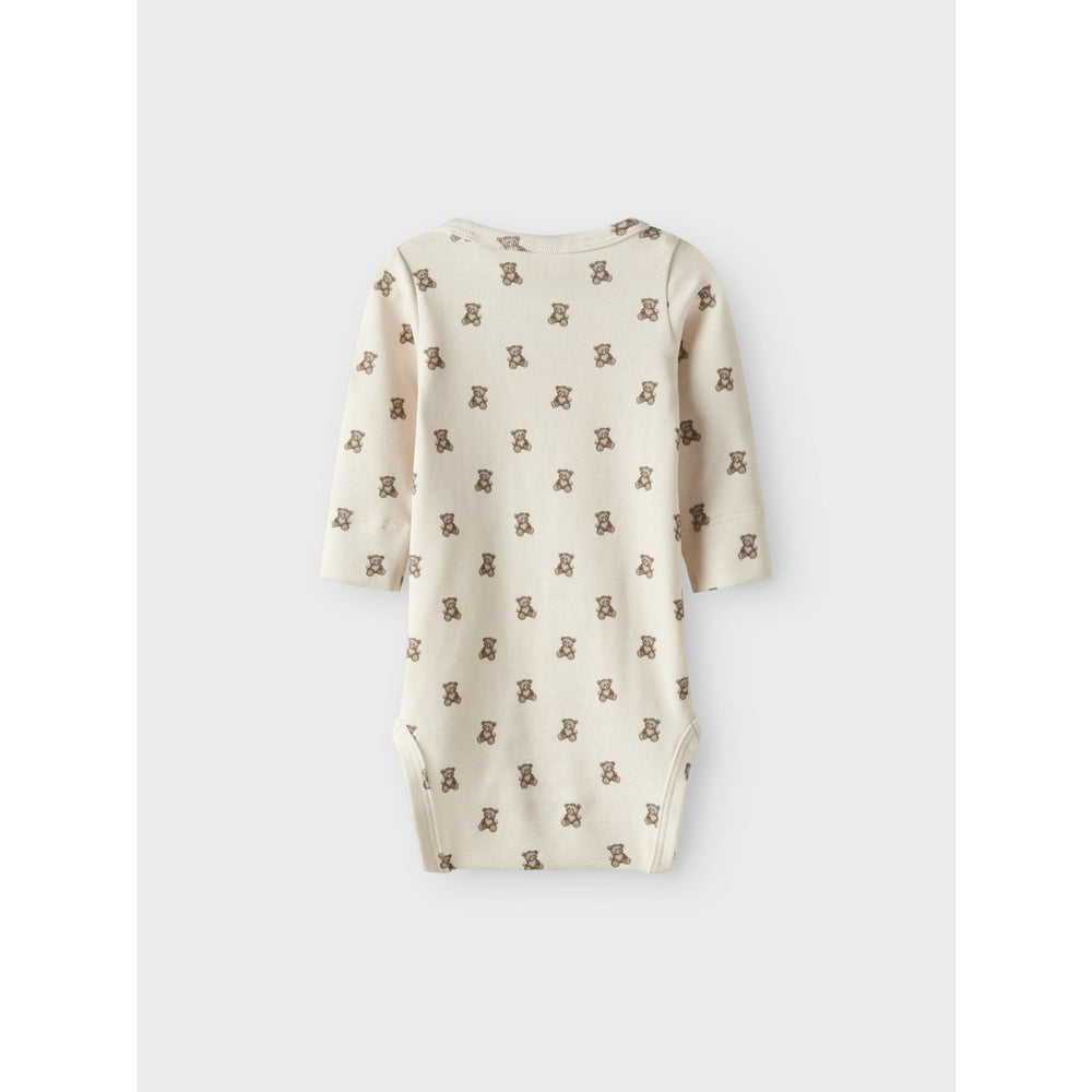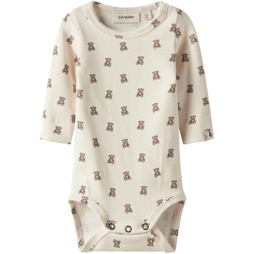 Dress your little one in the Lil'Atelier Turtledove Teddybear Nbngayo Elo Ls Slim Body Lil Noos bodysuit, designed for both comfort and style. Crafted from soft, stretchy jersey fabric, it ensures a gentle touch against your child's skin while providing ample flexibility for movement. This charming bodysuit showcases a delightful, all-over print that adds a playful touch, perfect for any fun-loving infant.
