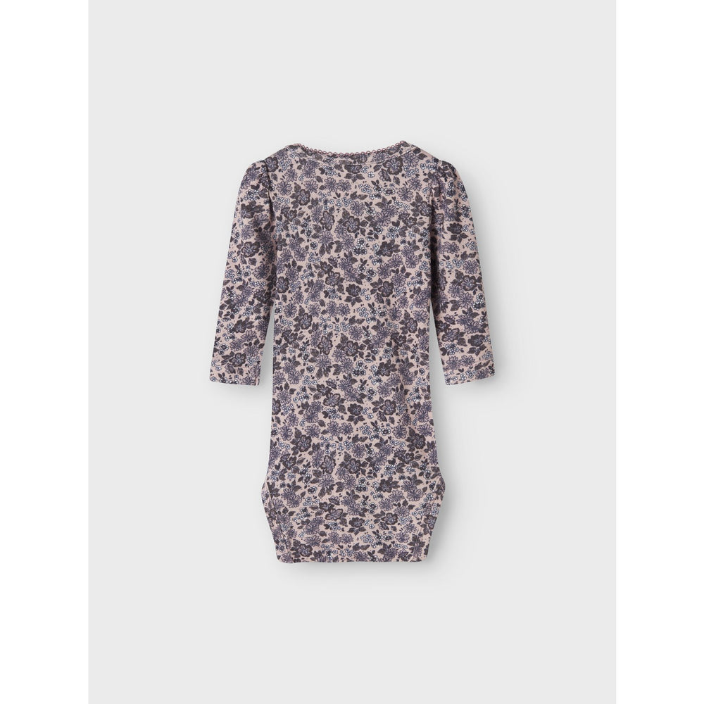 Introducing the Name It Burnished Lilac Nbfoalia Ls Body, a charming addition to your child's clothing collection. Crafted from rib knit material, this bodysuit boasts excellent elasticity and a vertical striped pattern, ensuring both comfort and a classic style. It features a round neck and long, puff sleeves that add a touch of whimsy to the overall design. The lilac color, beautifully complemented by a repeated print, makes this piece both vibrant and eye-catching.