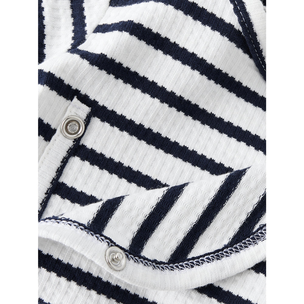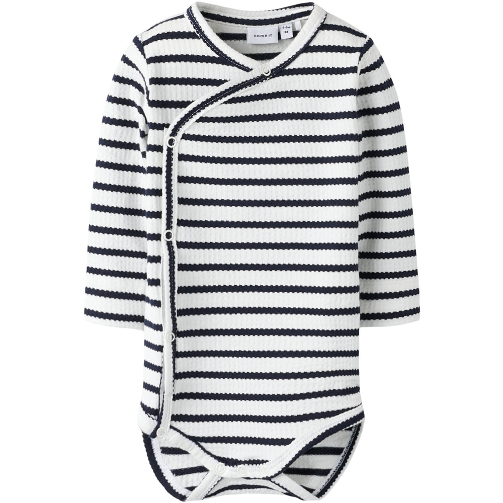 Introducing the stylish Name It Cloud Dancer Sky Captain Nbfkattie Ls Wrap Body, an ideal choice for your child's daily adventures. Crafted with a rib knit that ensures good elasticity, this bodysuit features a comfortable V-neck and long sleeves for cozy wearability. The vertically striped pattern not only adds a touch of timeless elegance but also promotes a snug fit. Perfect for all-year-round use, the garment is easy to care for and stays vibrant even after multiple washes. This bodysuit combines functionality with a fun, fresh fashion sensibility, keeping your little one both safe and trendy. Closure: Press Stud Materials: 95% Cotton - Organic, 5% Elastane Materials and care: Wash with similar colors Washing instructions: Maximum Washing Temperature 40°C - Normal Process
