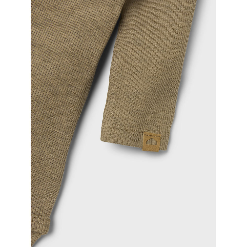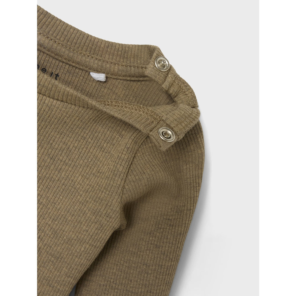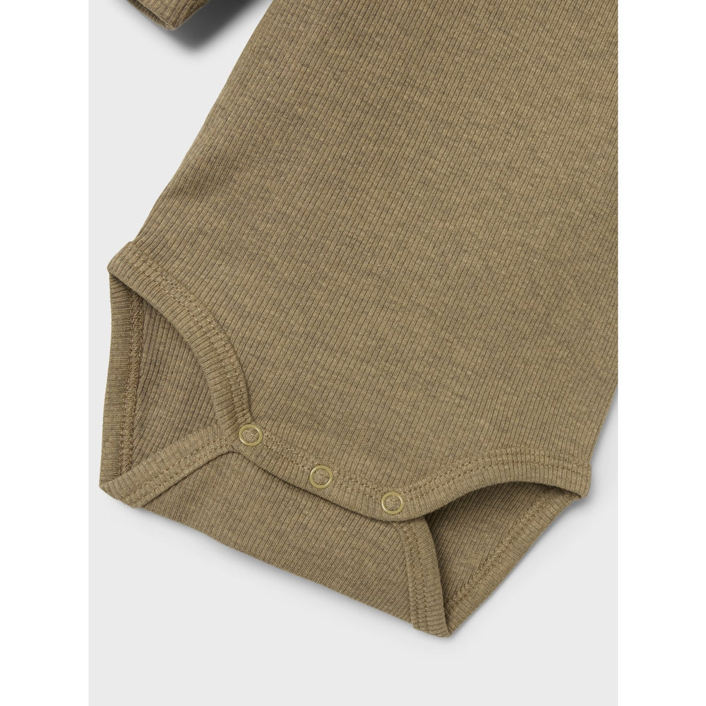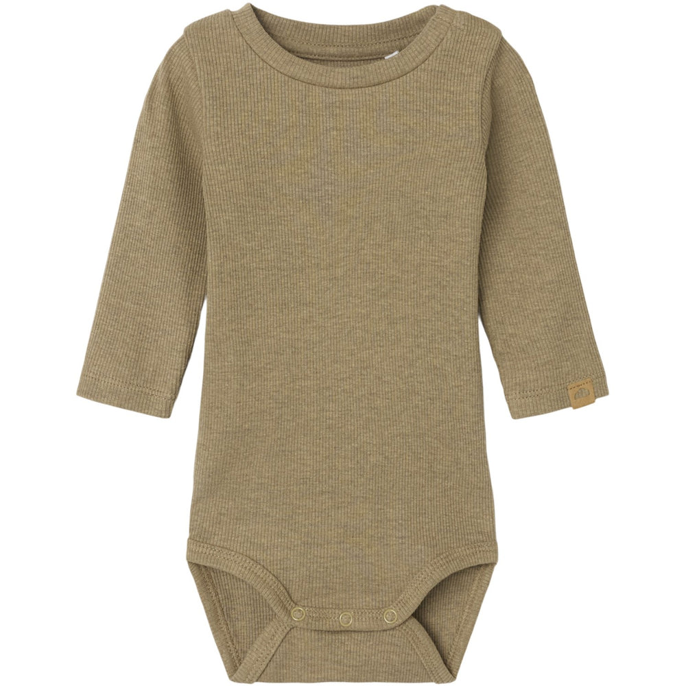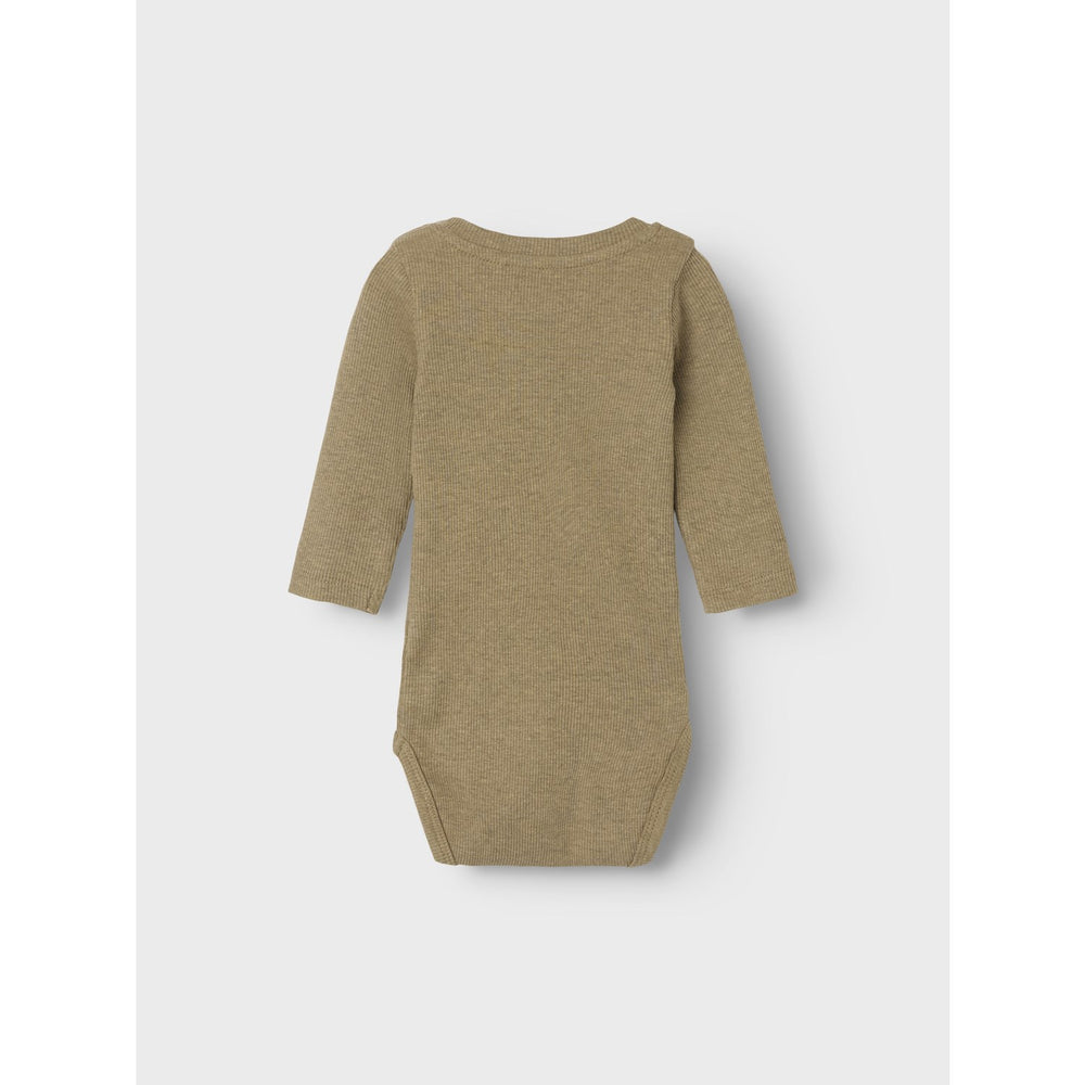 Introducing the Name It Elmwood Melange Donny Body, a staple for your little one's closet crafted with comfort and style in mind. Made with our cozy rib knit, characterized by its vertical stripes and superior elasticity, this bodysuit ensures a snug, yet comfy fit with enough stretch for playtime adventures. The timeless design features a round neck, long sleeves, and an easy-to-manage press stud fastening, ideal for quick changes. Designed in delightful colors and patterns, it adds a dash of charm to any outfit. The addition of a cute badge detail lends a playful touch. Remember, the fabric requires keeping away from fire. Perfect for all-year-round wear, it makes dressing effortless and keeps your child comfortable and chic.
