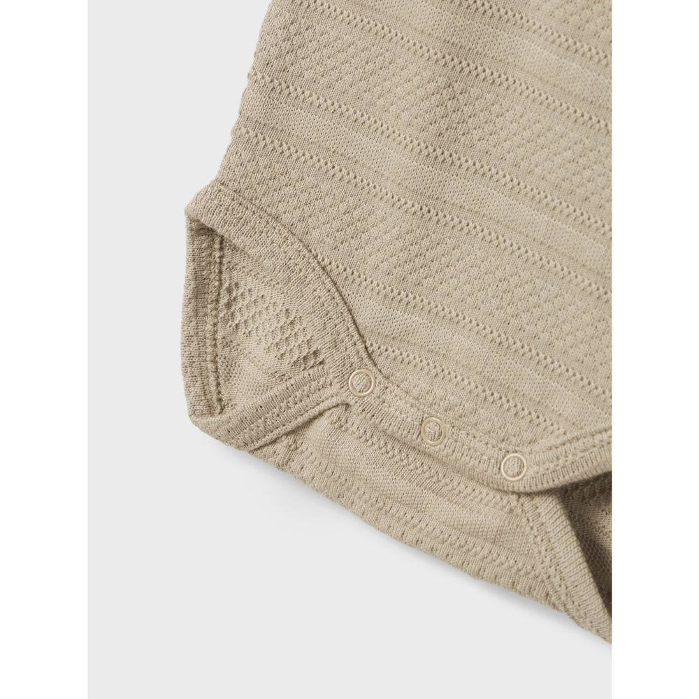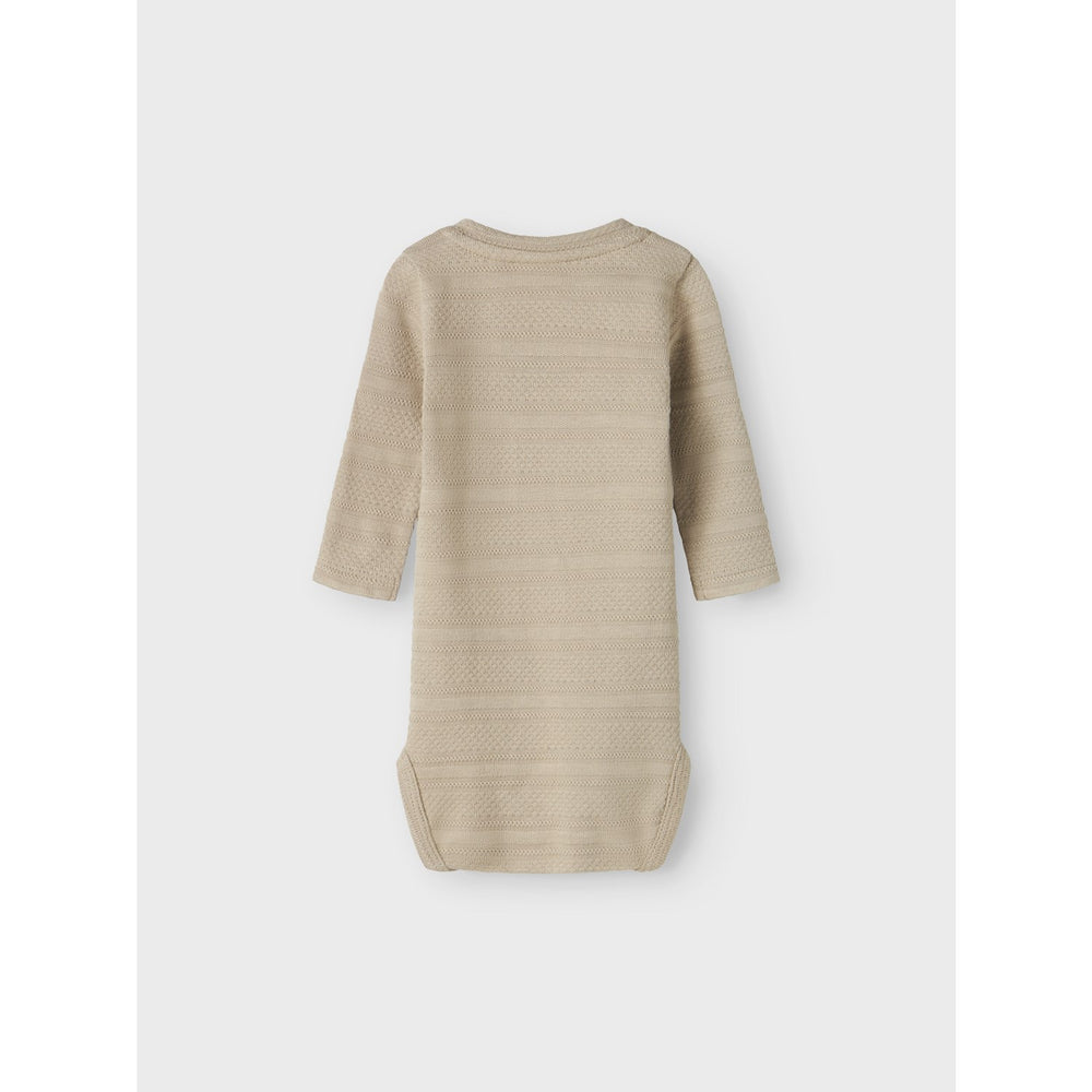 Introducing the Name It Island Fossil Nbnommi Ls Body, a must-have for your child's clothing collection. Crafted from elegant jacquard with a woven pattern, this bodysuit combines style and practicality. It features a round neck, long sleeves, and convenient press stud fastening for easy dressing. The added front pocket and chic badge detail enhance its charm, while the snug fit ensures comfort. Be sure to keep this garment away from fire. Perfect for all-year-round wear, it brings both function and fashion to your little one's ensemble.