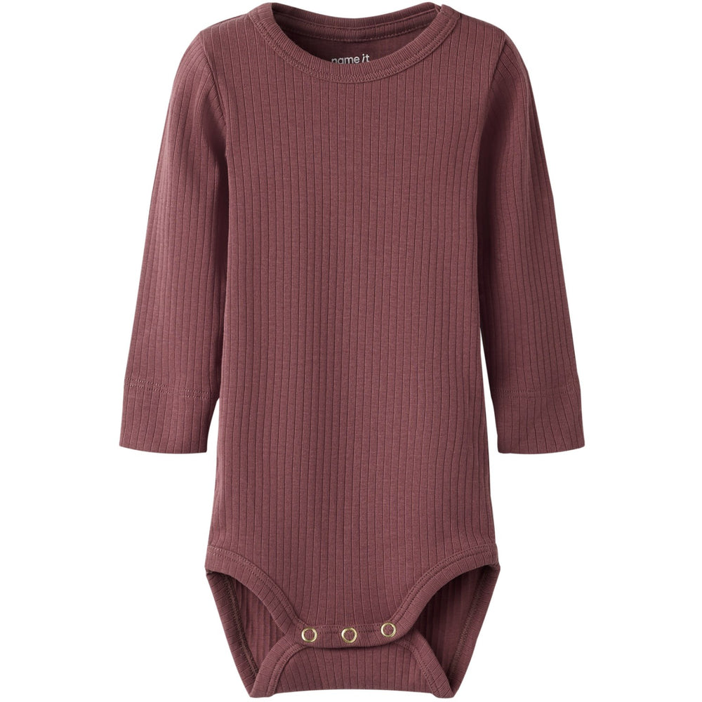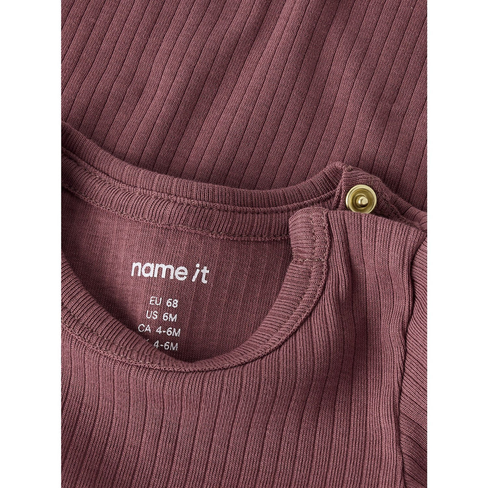 Delight in the soft embrace of our Name It Rose Brown Nbfofulla Ls Slim Body, a quintessential addition to your child's clothing collection. Fashioned with premium rib knit to ensure stretch and comfort, this bodysuit showcases a classic vertical striped pattern in a charming rose brown hue, perfect for any season. Thoughtfully designed with long sleeves, a round neck, and convenient press stud fastenings at the crotch and shoulder for easy dressing, this piece combines functionality with style. Keep your little one stylish and safe, as this garment adheres to safety standards with a fire warning for extra precaution. Ideal for both comfort and mobility, it's a must-have that promises to make parenting a bit easier and a lot more fashionable.