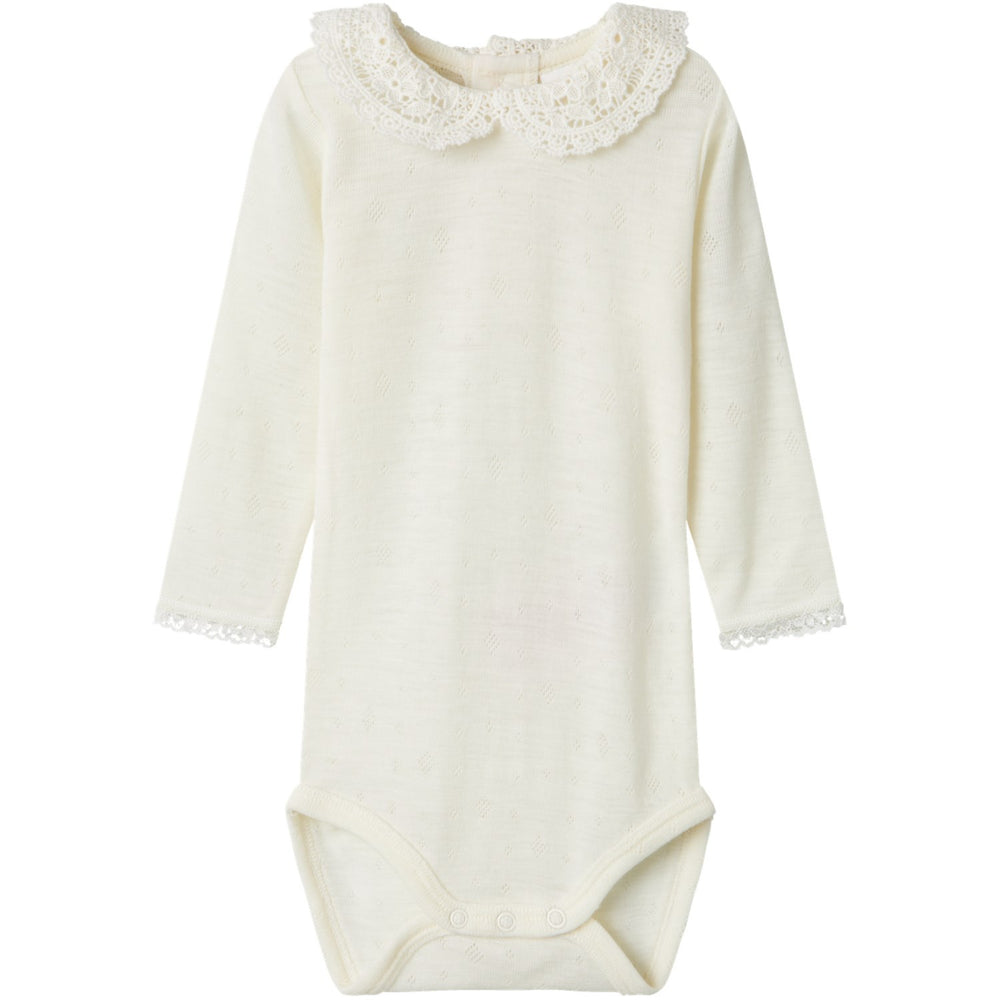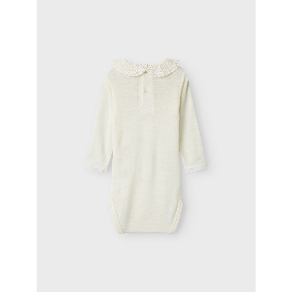 Dress your little one in the Name It Snow White Wang Wool Needle Body With Collar. Crafted from soft, cozy wool, this bodysuit guarantees comfort throughout the seasons. Featuring unique needle drop patterns that create adorable designs, this piece has long sleeves and a round neck accented with delicate lace details. The convenient button and press stud fastenings make dressing easy. Perfect for both casual wear and special occasions, it blends functionality with a charming style.