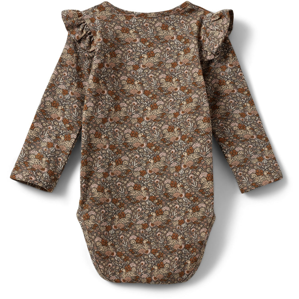 - Extra: • Brown floral print bodysuit with little ducks • Long sleeves and cute ruffles on the shoulders. • Made from a blend of cotton, modal and spandex.
