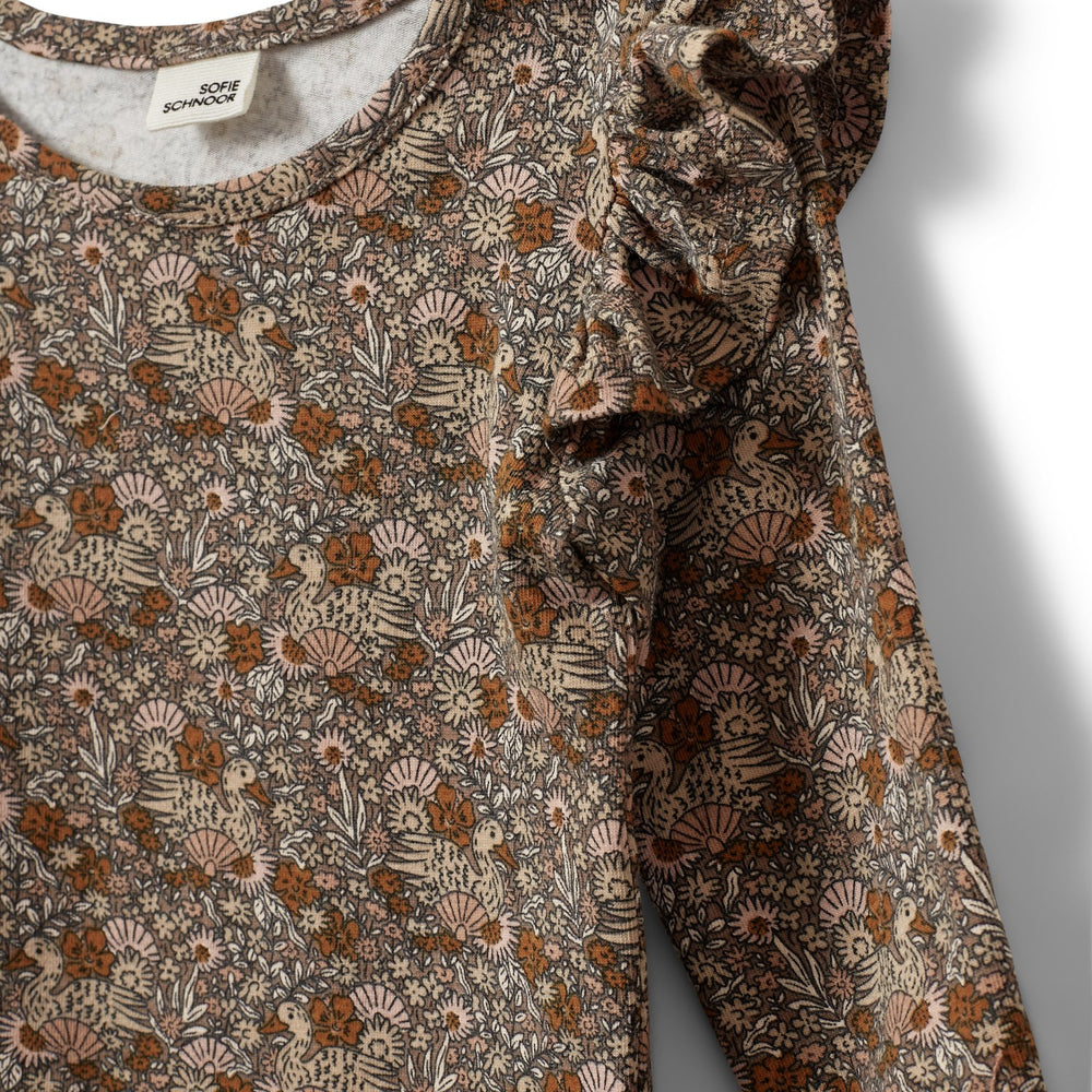 Discover Sofie Schnoor's charming "DicteSB" bodystocking that will make every little one shine! Designed with an eye-catching brown floral print and small, cute ducks that add a fun twist. The long sleeves and cute ruffles on the shoulders add a touch of elegant details. This comfortable bodystocking is made from a soft blend of cotton, modal and spandex, ideal for play and little adventures throughout the day!