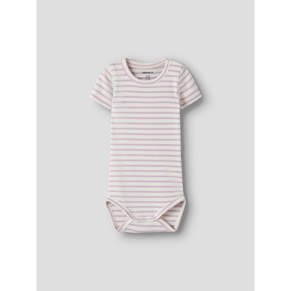 Dress your little one in the Name It Fragrant Lilac Nbnbani Ss Body Noos, a charming bodysuit that blends comfort with style. Crafted from rib knit material that offers excellent elasticity, this bodysuit features a classic striped pattern which enhances its visual appeal. The design includes a comfortable round neck and short sleeves, perfect for easy wearing. Available in a soothing lilac color, it ensures a trendy yet comfortable outfit for your child. Please note, for safety, keep this garment away from fire.