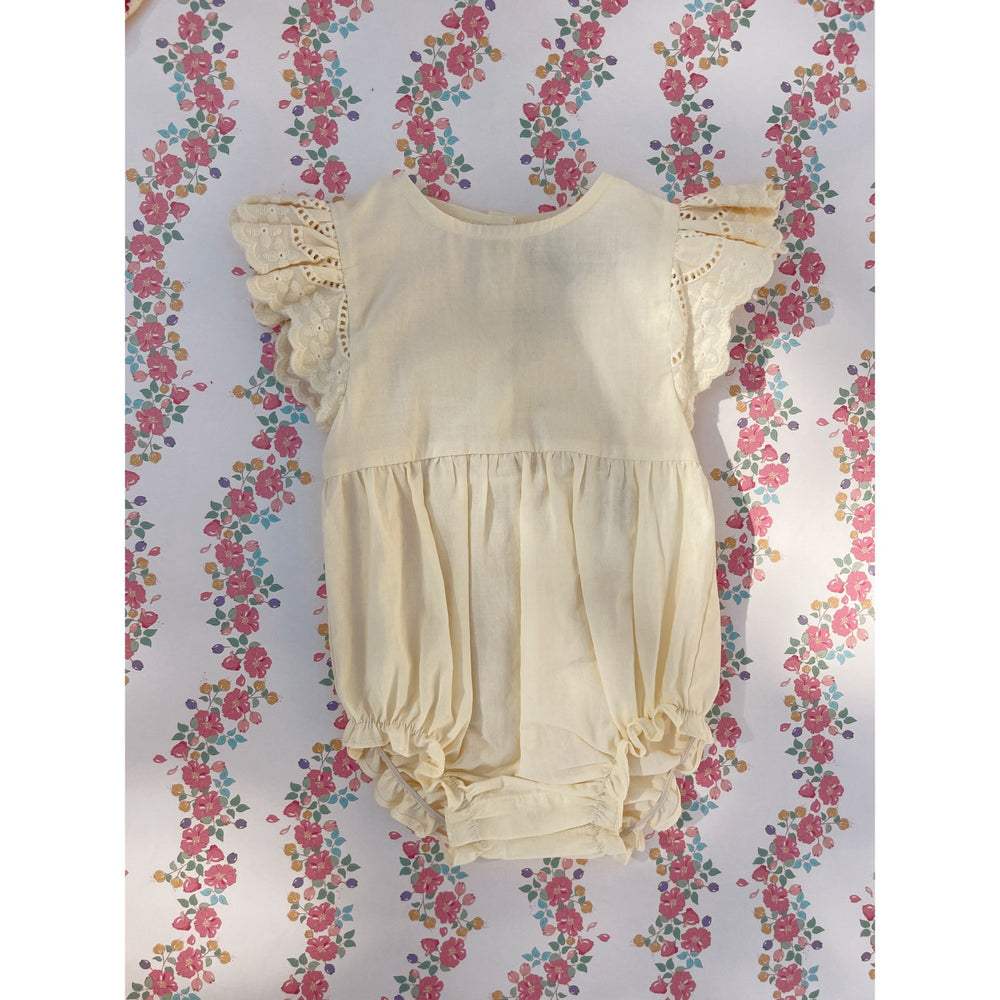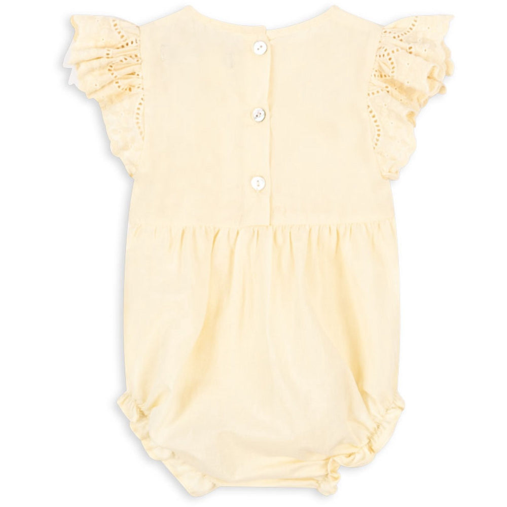 Discover the charm of the Konges Sløjd Cloud Cream Posey Romper, an enchanting addition to your little one's wardrobe. Crafted from soft, 100% cotton voile, this romper is adorned with exquisite broderie anglaise details for a touch of elegance. The thoughtful design includes push buttons at the leg opening, ensuring effortless dressing and comfort. Ideal for playful days and peaceful naps, its gentle material and functional features make it a must-have for your child's comfort and style.