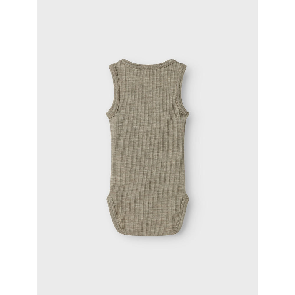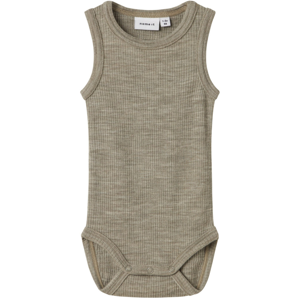Discover the Name It Dried Sage Nbnwax Wool Rib Tank Body, a perfect addition to your little one's wardrobe. Made from the finest wool, this bodysuit is designed not only for its aesthetic appeal but also for its impressive functionality. It features a sleeveless design with a comfortable round neck and convenient press stud fastening in the crotch for easy dressing. The soft, woolen material ensures it remains breathable, keeping your child comfortable regardless of the weather; its thermal qualities provide warmth during the cold months and absorb sweat in the heat. The charming dried sage color and ribbed pattern add a touch of style, making it versatile for any occasion and season. Due to wool's natural ability to maintain insulation even when wet, this bodysuit is ideal for keeping your child’s body temperature stable. Easy to care for and durable, it promises to be a timeless piece that blends comfort with style.