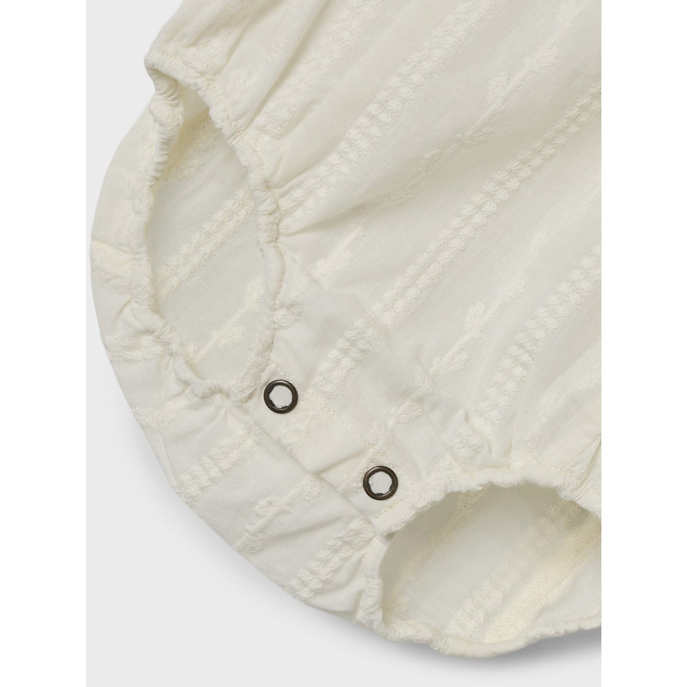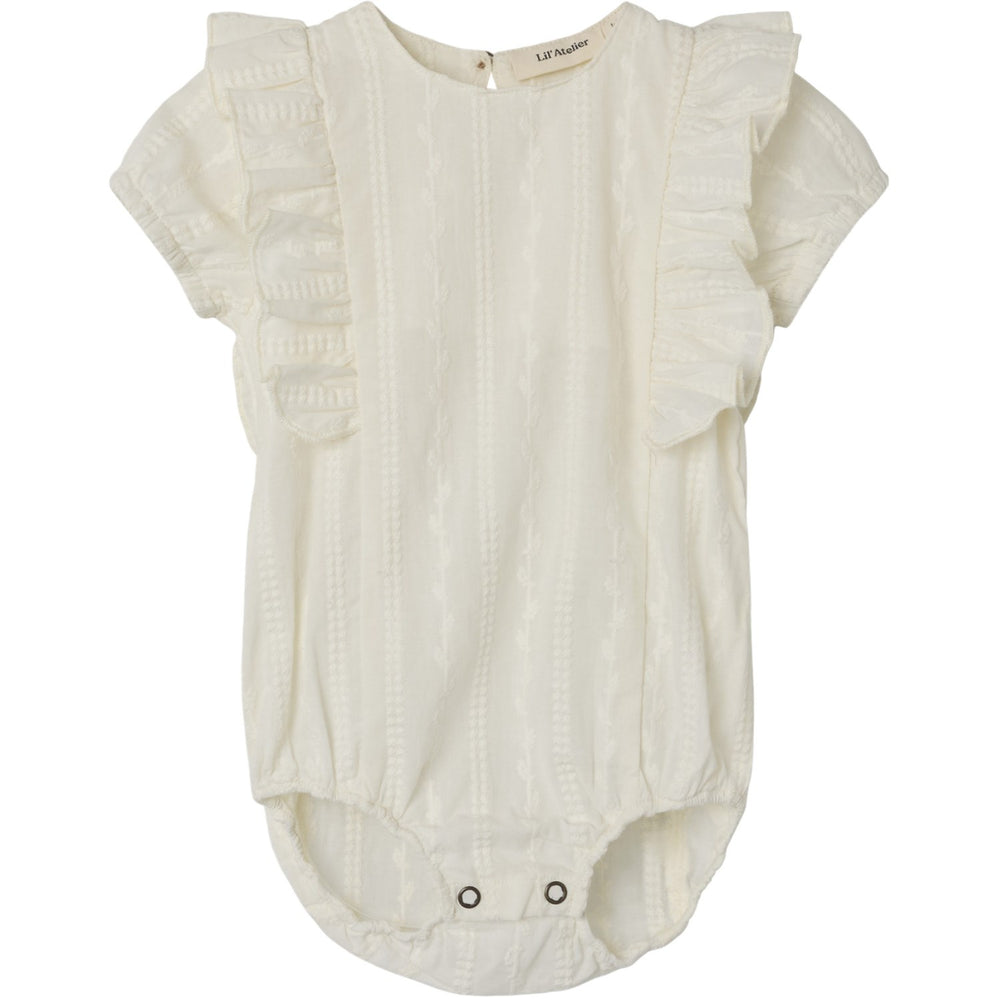 Dress your little one in the Lil'Atelier Coconut Milk Nbfjazelle SS Loose Body Shirt, exuding comfort with its soft, woven fabric featuring a classic criss-cross pattern. This charming bodysuit boasts a round neck, short sleeves, and delightful frills for a trendy touch. It's designed for easy dressing with button and loop, plus press stud fastenings. Available in a soothing, neutral tone, it ensures a perfect fit and effortless style for everyday wear. Remember, keep this adorable piece away from fire during use. Ideal for both style and comfort, let your child enjoy the blend of fashion and functionality!