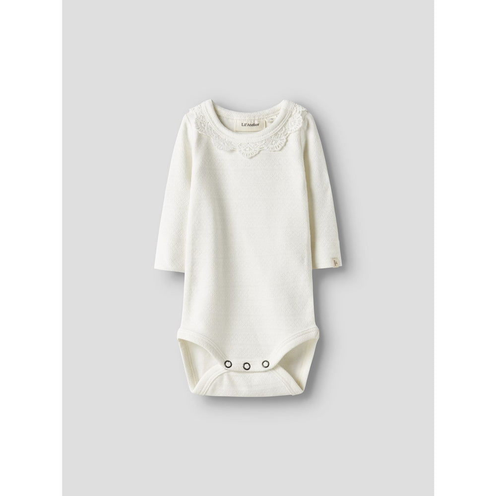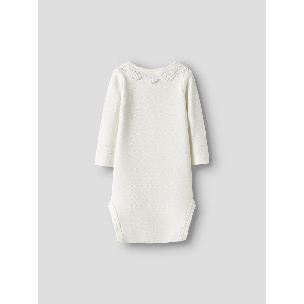 Dress your little one in the adorable Lil'Atelier Coconut Milk Nbftapia Ls Slim Body Bodysuit, blending comfort with trendy design. This premium bodysuit features a charming needle drop pattern with unique dropped stitches for subtle detailing. Fitted with practical long sleeves, a round neck, and press stud fastenings at the shoulder and crotch, it ensures easy dressing. Delicate lace details enhance its appeal, while the snap closures facilitate effortless diaper changes. Crafted from cozy materials, this bodysuit promises both durability and softness for sensitive skin. Perfect for daily wear, it keeps your child stylish and comfortable throughout the day. Please note, keep away from fire to ensure your child's safety. Materials: 95% Cotton - Organic, 5% Elastane Washing instructions: Maximum Washing Temperature 40°C - Normal Process Extra: The main material in this product contains a minimum of 50% organic cotton. Organic cotton is grown without the use of harmful chemicals. Organic cotton farming protects natural resources and biodiversity.