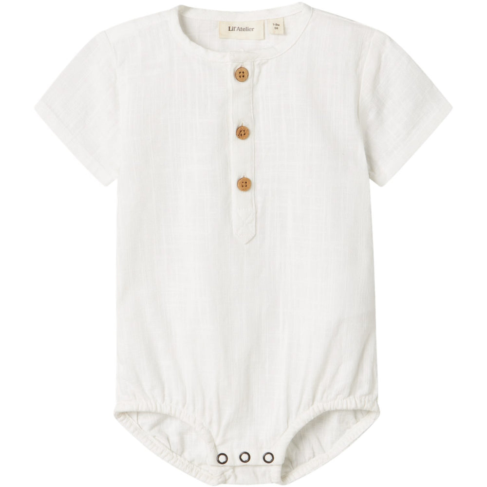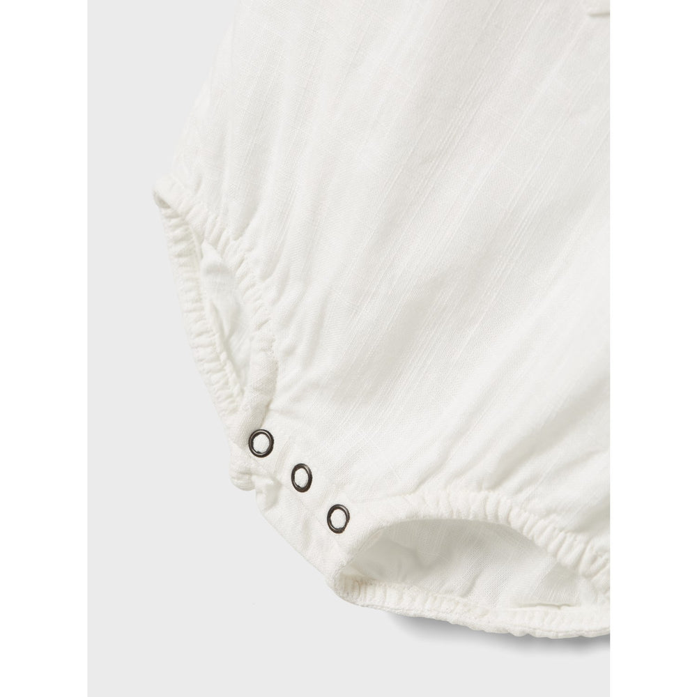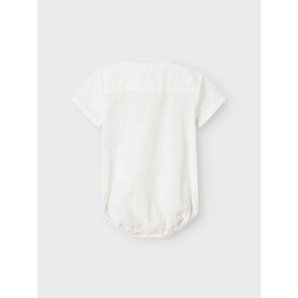 Dress your little one in the Lil'Atelier Coconut Milk Nbmhugo Ss Loose Body Shirt, an epitome of comfort and style. This bodysuit is crafted from a beautifully woven fabric featuring a criss-cross pattern that gives it a lightly textured, classic appearance. Complete with short sleeves, a grandad neckline, and dual fastening options with buttons and press studs, it offers both fashion and functionality. Available in a soothing coconut milk color, this piece ensures your child stays comfortable and trendy. Carefully designed to be easy to care for, keep in mind the fabric's proximity to fire. Perfect for everyday wear, it complements your child’s wardrobe effortlessly.