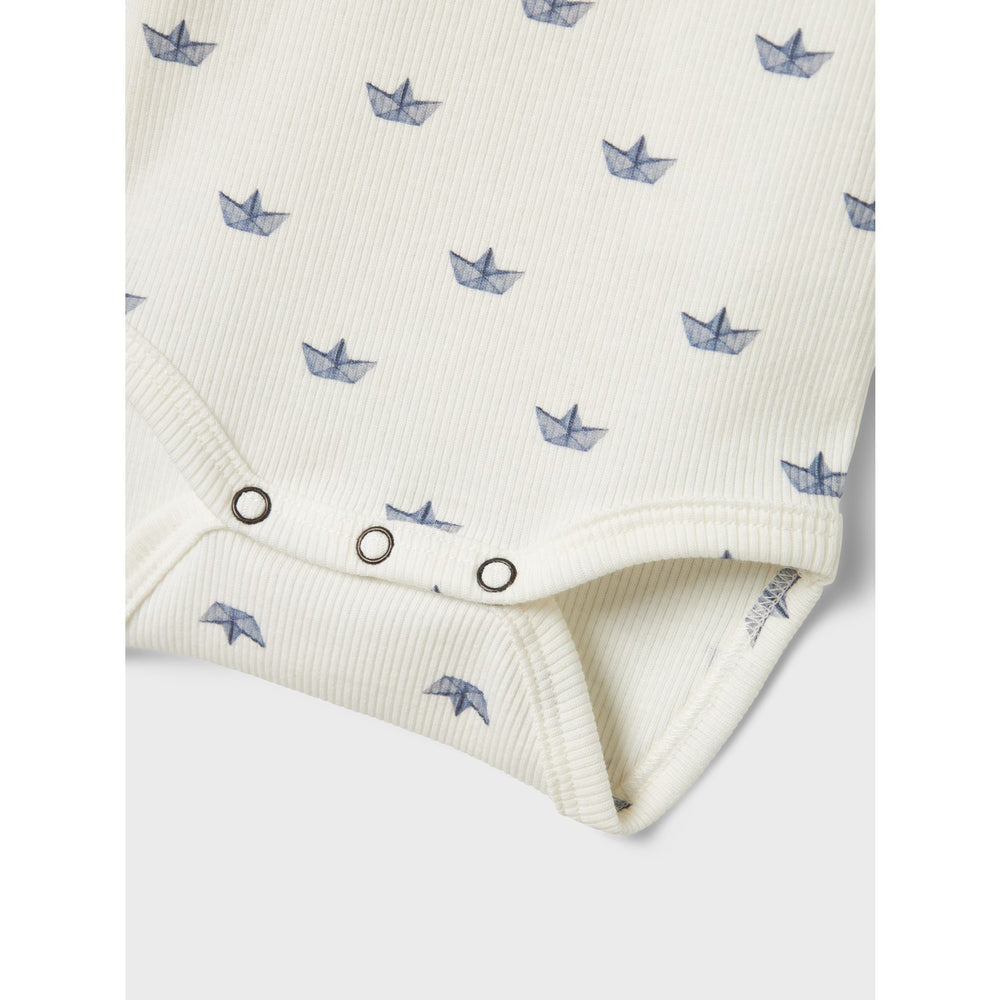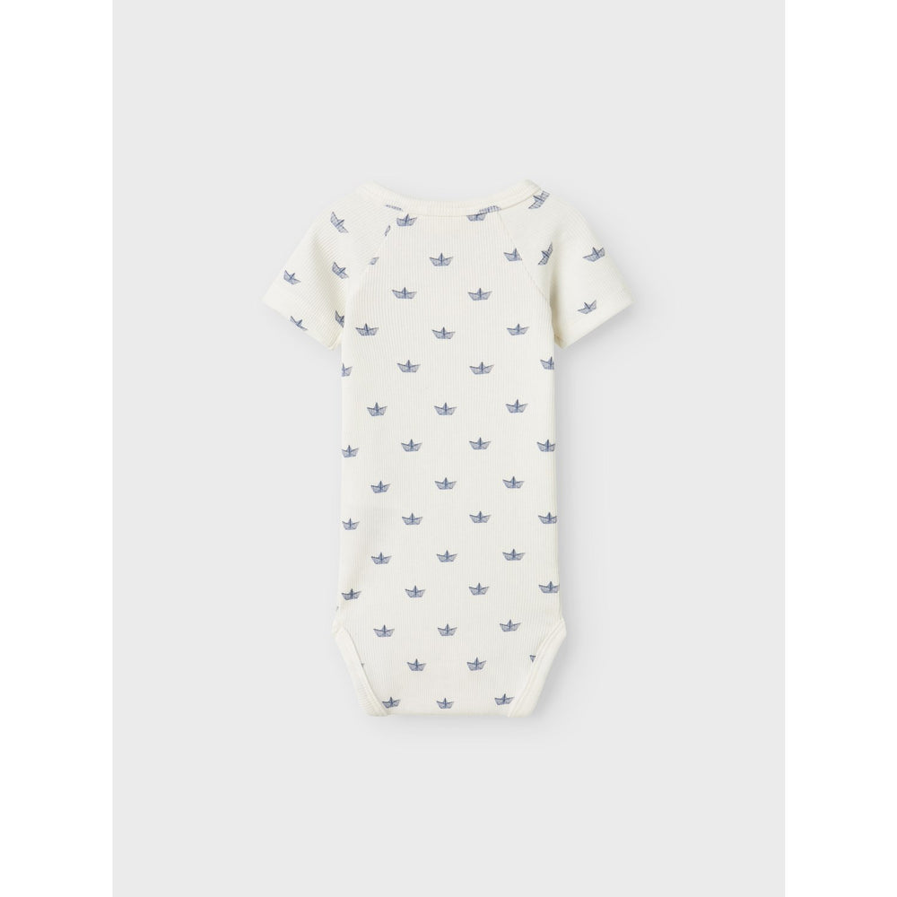 Dress your little one in comfort and style with the Lil'Atelier Coconut Milk Paper Boat Nbmlavo Eni Ss Slim Body. This charming bodysuit crafted from soft, stretchy jersey ensures a snug fit while offering ample freedom for playful movements. Designed with short sleeves and an easy-to-use grandad neck, it features convenient press stud fastenings at the shoulder and bottom to simplify dressing and changing. The delightful boat print adds a whimsical touch to this everyday essential. Plus, be assured of safety, as it carries a caution to keep away from fire. Ideal for layering or wearing on its own, this bodysuit combines fashion with functionality, making it a must-have in your child's wardrobe.