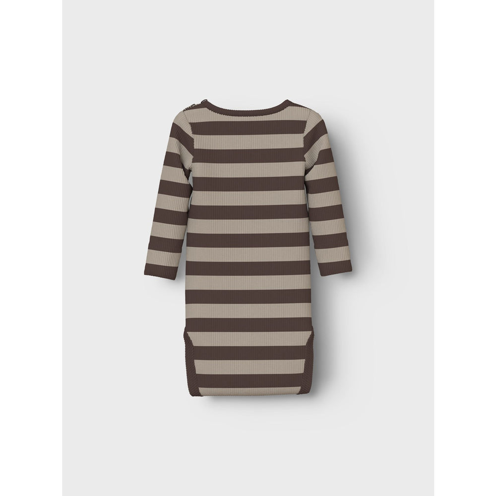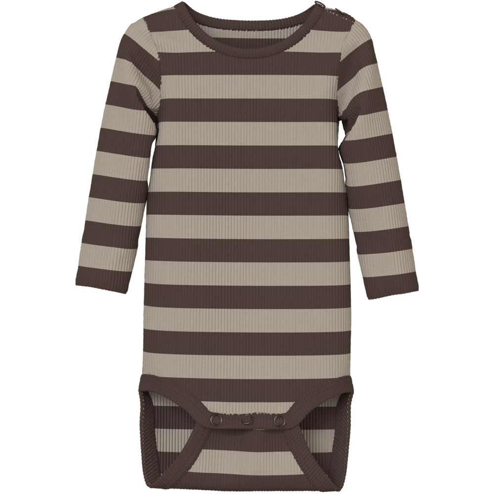 Introducing the Name It Bracken Danny Body - a delightful addition to your child's clothing collection. Crafted from a cozy blend of cotton and elastane, this bodysuit features a rib knit design with a vertical, striped pattern that not only ensures elasticity for comfort but also provides a classic, timeless appearance. Featuring a round neck and long sleeves, it’s ideal for all-year wear. The practical press stud fastening makes dressing quick and hassle-free. Please note, keep this garment away from fire. This sweet, stylish bodysuit merges functionality with fashion, making it a must-have for your little one.