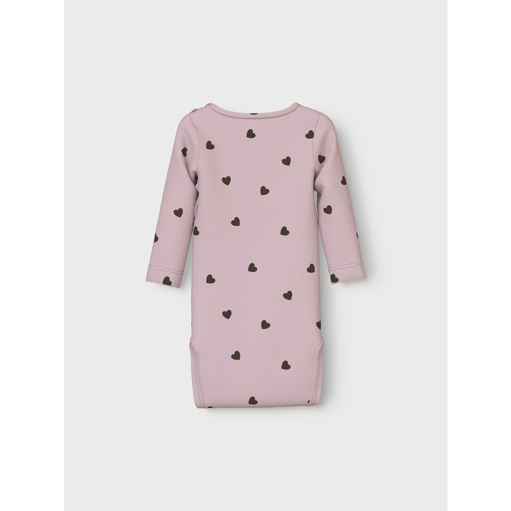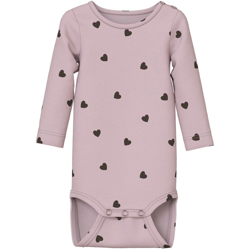 Introducing the Name It Burnished Lilac Nbfkheart Ls Body - a staple for any child's wardrobe. This bodysuit is crafted with rib knit fabric for optimal comfort and elasticity, ensuring a snug yet flexible fit. Designed with a charming all-over print and featuring practical press stud fastening for easy dressing, its long sleeves and round neck contribute to its classic appeal. Ideal for year-round use, this bodysuit combines style with safety, as it's made with fire-retardant materials. Perfect for both playtime and naptime, it's a functional and stylish choice for your little one.