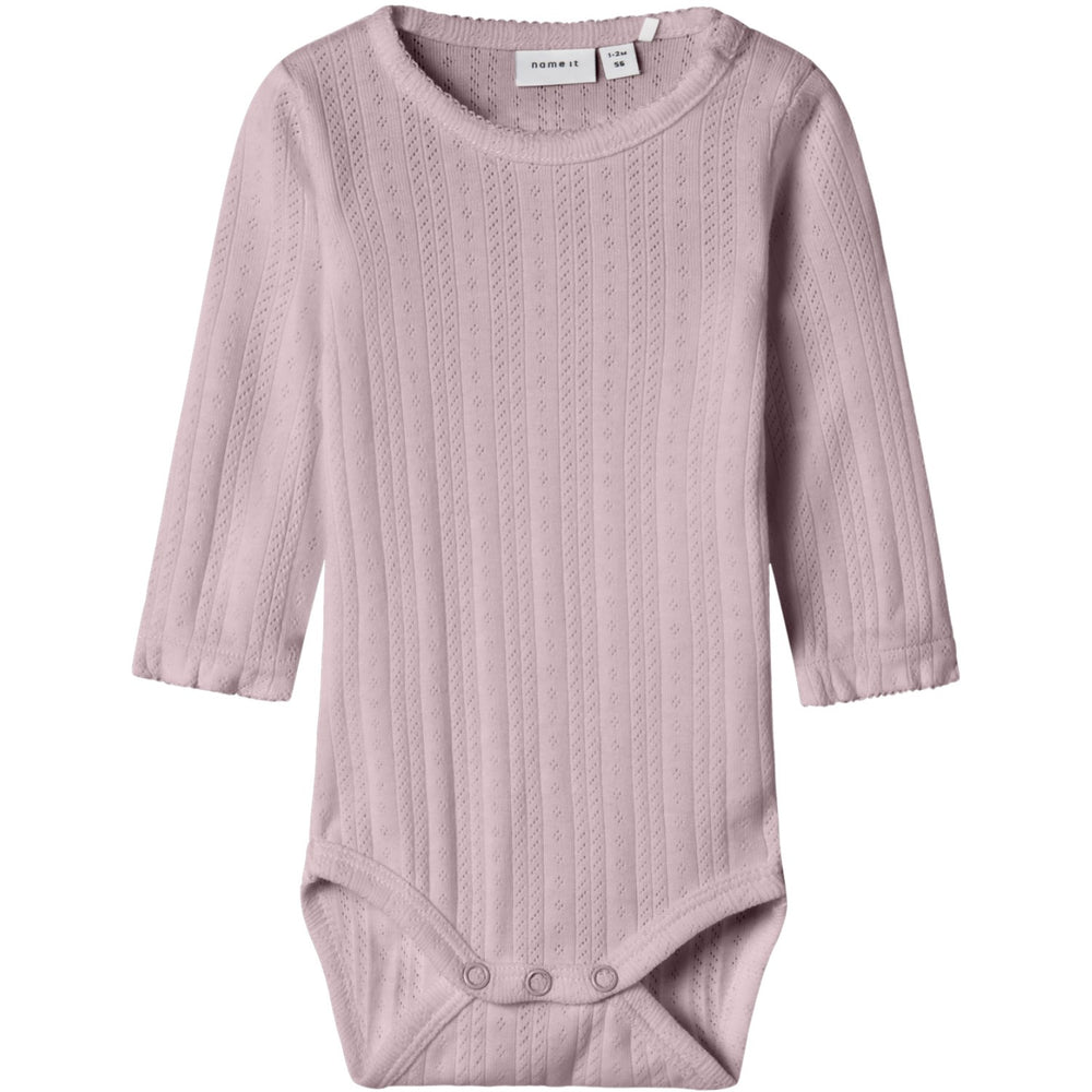 Introduce a touch of cozy charm to your little one’s collection with the Name It Burnished Lilac Nbfkisa Ls Body. Crafted with rib knit material that ensures softness and excellent stretchability, this bodysuit features a classic vertical stripe design for a timeless style. It comes in a gentle lilac shade with a comfortable round neck, long sleeves with elasticated cuffs, and convenient press stud fastening for easy changes. Plus, it's important to keep it away from fire for safety. Ideal for year-round wear, this piece combines comfort, ease, and adorable aesthetics, making it a must-have in every infant's wardrobe!