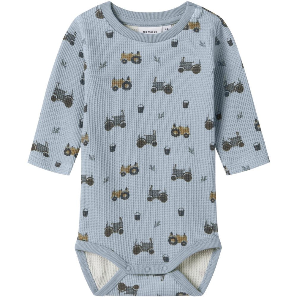 Brighten up your little one's wardrobe with our Dusty Blue Nbmlactor Ls Body. Crafted from cozy waffle knit fabric, this bodysuit features a unique texture with a cool pattern of small rectangles. It's styled with a round neck and long sleeves, offering a snug fit perfect for year-round wear. The full-body print catches the eye, while the press stud fastening ensures easy dressing. Durable and easy to care for, this piece keeps your child comfortable and stylish. Plus, always be sure to keep it away from fire for safety. A delightful addition to any child's clothing collection!
