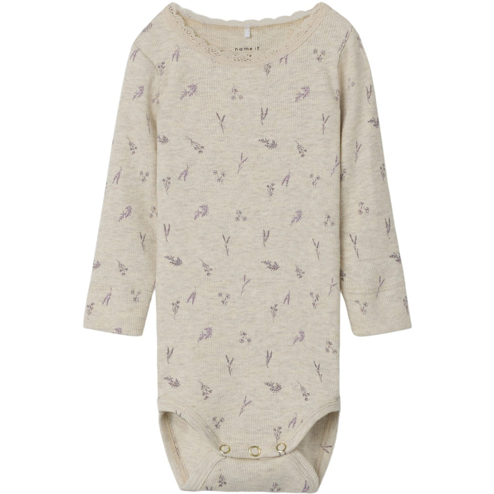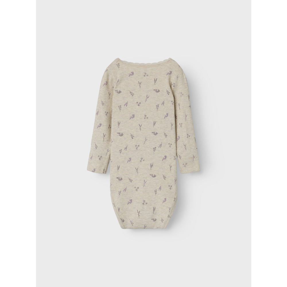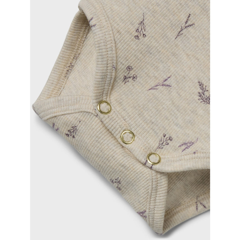 The Name It Peyote Melange Small Flower Dabua Body offers delightful comfort and style for your little one. Crafted from rib knit with excellent elasticity, these bodysuits ensure a snug, comfy fit and feature a charming vertical stripe pattern. Available in a set with long sleeves and an easy-to-use press stud fastening, each piece is adorned with a cute floral print and delicate lace details. Perfect for all-year usage, these bodys are soft, durable, and practical, making them an essential addition to any child's wardrobe. Please note to keep these garments away from fire.