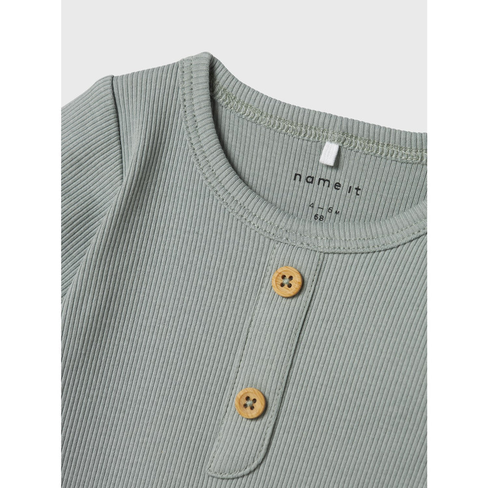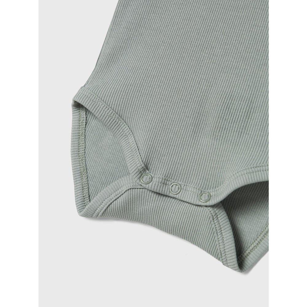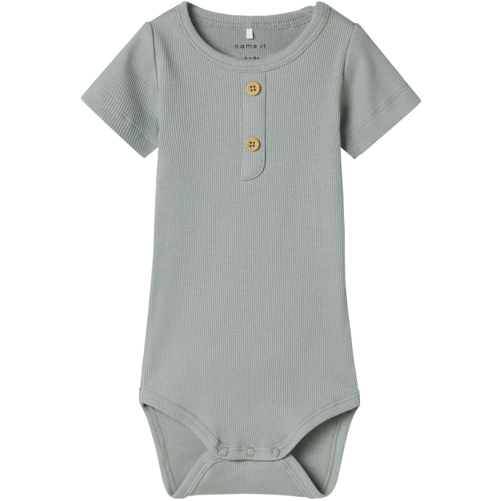 Introduce your little one to the cozy comfort of the Name It Slate Gray Jular Body, crafted from soft, stretchy jersey material designed for ultimate comfort and movement. This stylish bodysuit features a sleek slate gray hue, adorned with subtle button details and a classic round neck paired with short sleeves. Ensuring ease of wear, it is equipped with a practical press stud fastening. Ideal for year-round wear, this piece combines charming design with essential safety, including a fire safety warning. Perfect for both daily wear and special occasions, this bodysuit blends function with a touch of elegance.