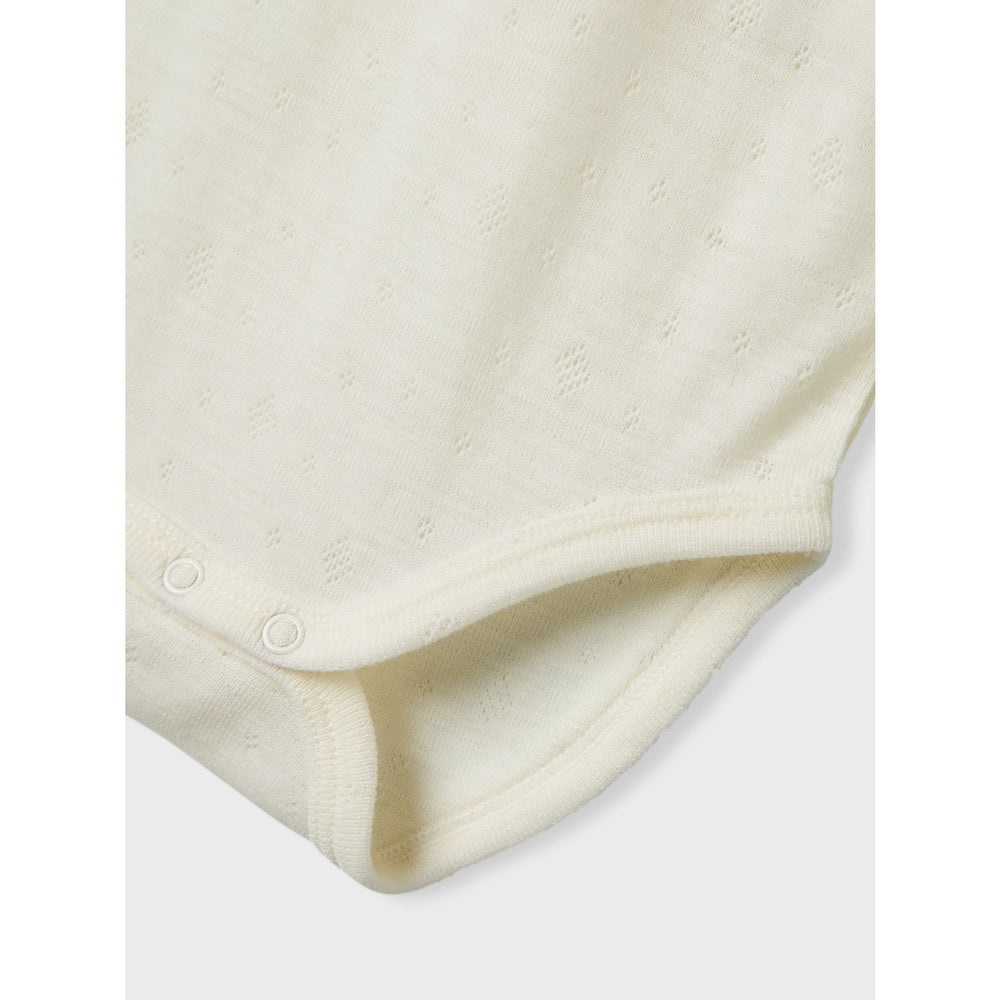 Introduce your little one to the charming comfort of the Name It Snow White Wang Wool Needle Body. Expertly crafted from soft wool, this bodysuit features a unique needle drop pattern with dropped stitches for a distinct and adorable style. It's designed with a round neck, cozy long sleeves, and easy press stud fastening complemented by delicate lace details. Available in a variety of sizes, this bodysuit combines fashion with functionality, ensuring that your child stays comfortable and stylish in any season. Perfect for daily wear or special occasions, it's a versatile addition to any young wardrobe.