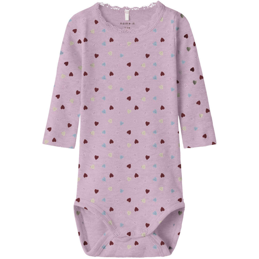 Brighten your little one's day with the Name It Winsome Orchid Smiles Bodysuit. Crafted from cozy rib knit featuring a vertical striped pattern, this bodysuit combines enduring style with a snug fit, ensuring easy movement and comfort. Available in charming prints spread uniformly over the fabric, it comes with long sleeves and an easy press stud fastening for quick changes. The round neck design enhances its classic appeal. Note: Please keep this garment away from fire.