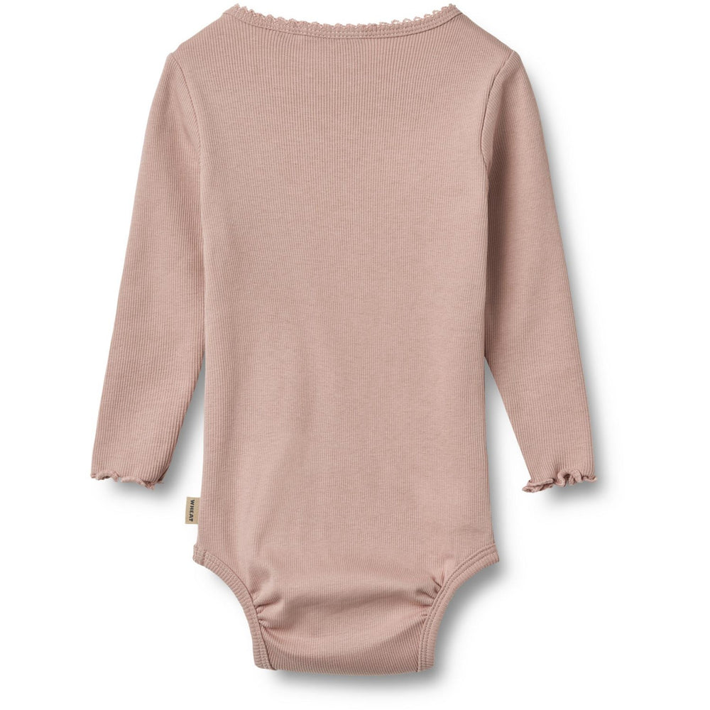 Discover the charm and comfort of the Wheat Rose Powder Body L/S Regitze, designed with your baby's needs in mind. This long-sleeved bodysuit features a delicate rib structure crafted from 95% organic cotton and 5% elastane, ensuring a snug yet stretchy fit. Delightful details include cotton picoting lace at the neckline and adorable frill edges at the cuffs, adding a touch of whimsy to the simple yet stylish design.
