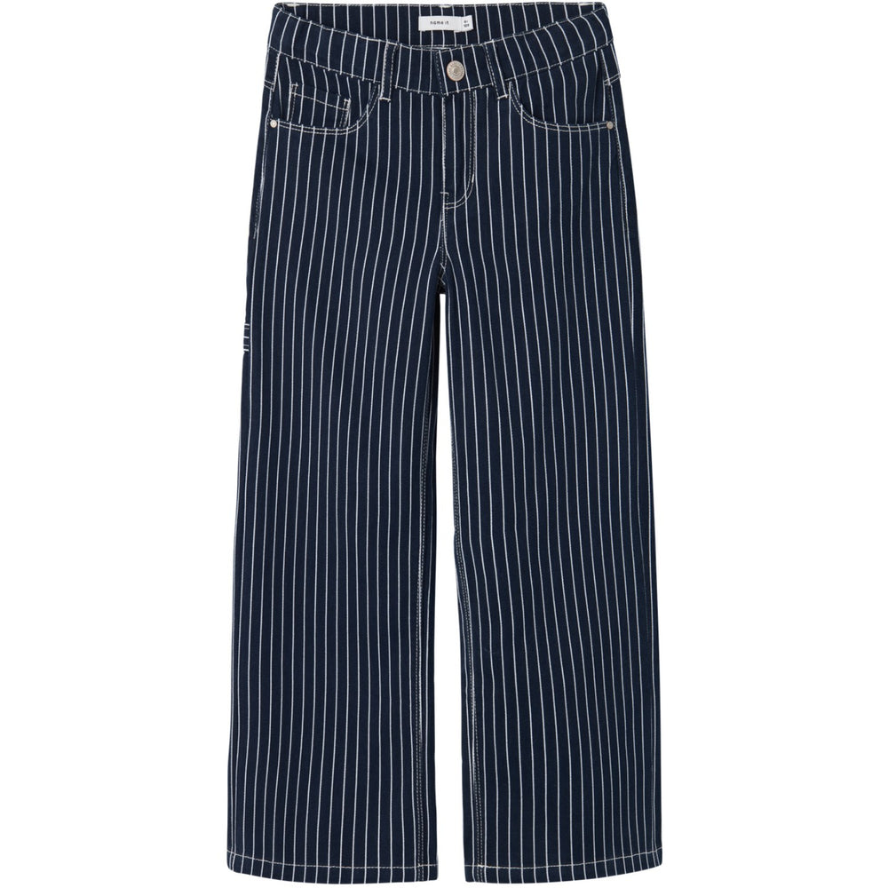 Dress your little one in the charming Name It Navy Blazer Rose Wide Twill Stripe Pants, designed for both style and comfort. Crafted from durable twill with a classic diagonal weave, these wide-leg trousers feature a playful stripe print across the full surface. Perfect for growing kids, they include an adjustable waist, hook button and zip fly closure, and both front and back pockets. Regular fit at the hip and wide legs offer ample movement, making them ideal for playtime or outings. Easy to care for and irresistibly trendy, these pants will keep your child looking sharp and feeling comfortable all day long.